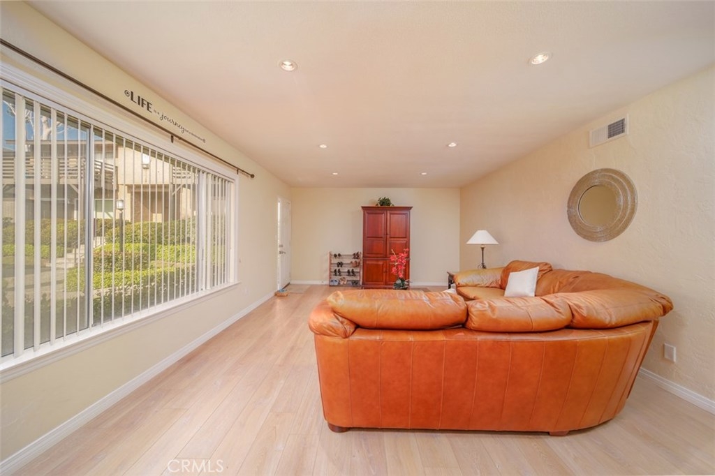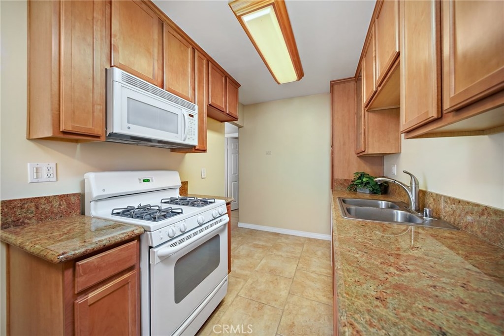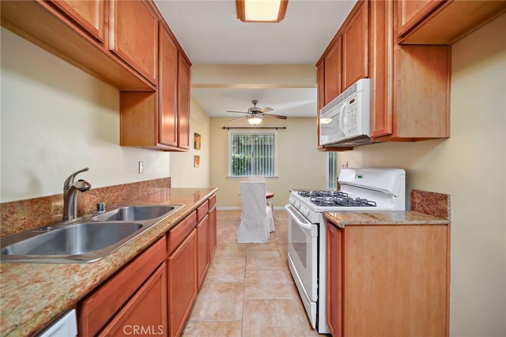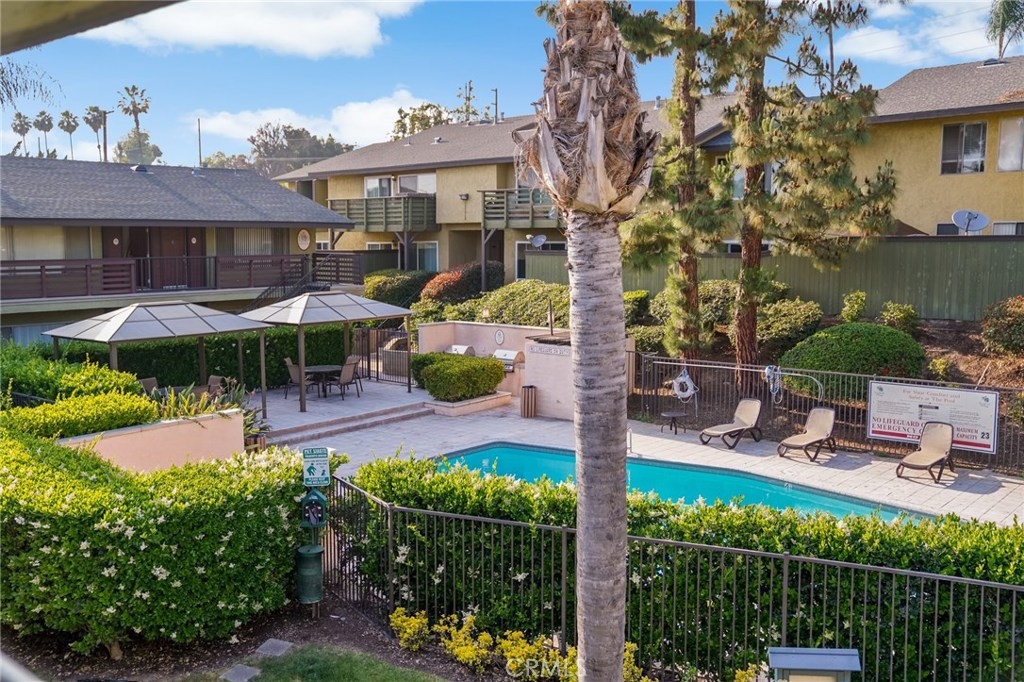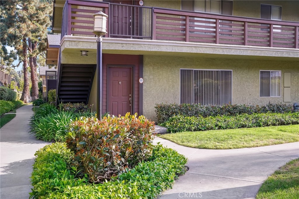 Great location, rare chance for a GROUND LEVEL, END unit, only attached on 1 side, away from the street! (Google maps is wrong.) More secure with Gated Parking and Controlled Access to community. Whole community was updated in 2005. Walk from car to condo with only one small step up. Comfortably large living room. Updated kitchen & bathroom with maple cabinets, granite counters, & beautiful tile floors. Fairly new dishwasher. New elegant bathroom vanity light & towel fixtures. New door handles. Remodeled fiberglass shower with copper plumbing, cast iron tub, & tiled walls. Updated flooring of beautiful laminate wood is only allowed on downstairs units per HOA rules. Recently painted. Recessed lighting. Ceiling fan. Central heating and air. Mirrored closet doors. Sliding glass door to a tropical oasis in the patio, open to above. One of the best units. Enjoy the pool & BBQ right outside. Can walk your pet along creek next to community. Storage at parking & lower storage possible. Water, Trash & Gas paid by HOA. OC property taxes are lower than LA County.