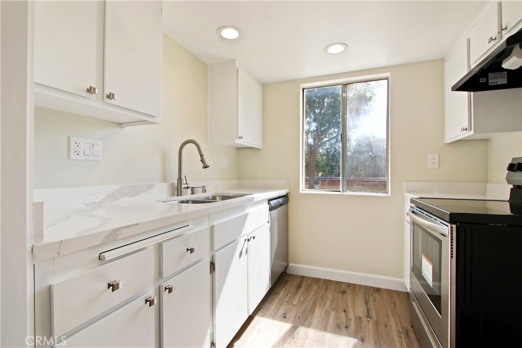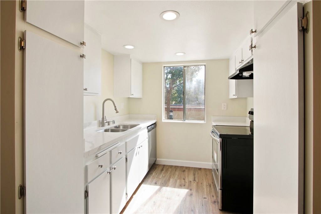 Welcome to this beautifully updated home located within the Gated Fashion Heights Condominium complex. Community amenities include pool and spa, barbecue area, sidewalks, landscaping, and more. This move-in ready end unit offers two spacious bedrooms, two bathrooms, and an enclosed patio. Behind the unit is a well lit open space with hillside views from the bedroom windows. Laminate type wood flooring welcomes you upon entry extending throughout the entire unit. A functional sized kitchen is paired with modern appliances and a separate dining area across. Updates include recessed lighting, quartz counters, new vanities, new fixtures, and a fresh coat of paint throughout. Wonderful location with restaurants, shops, banks, theater & post office nearby. This unit comes with a 2 car detached garage.