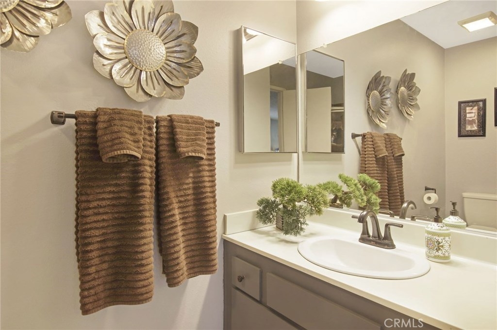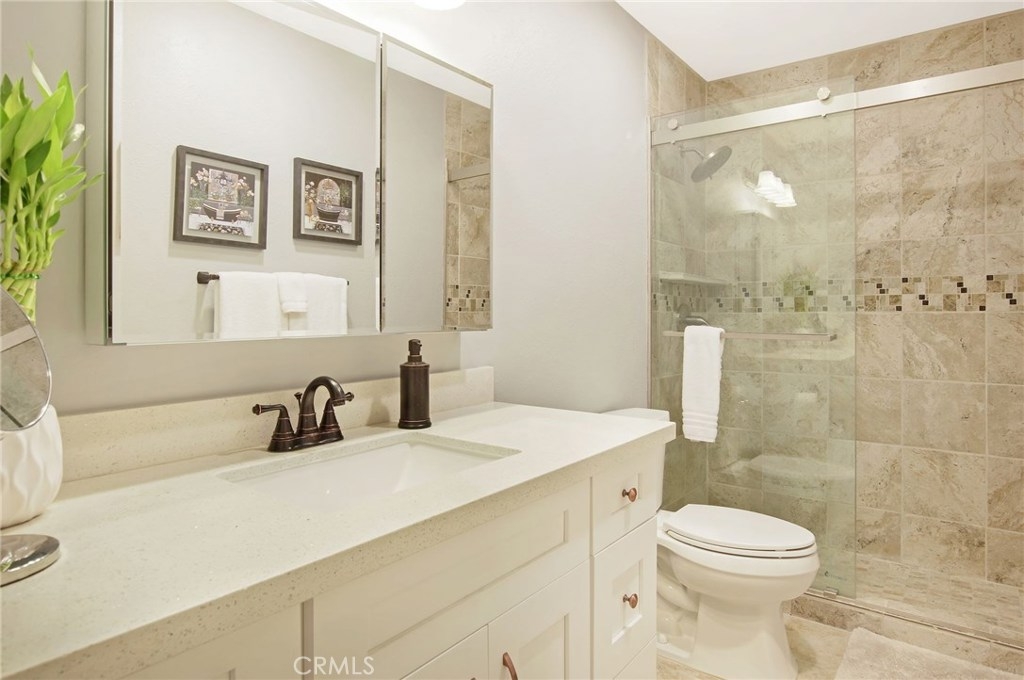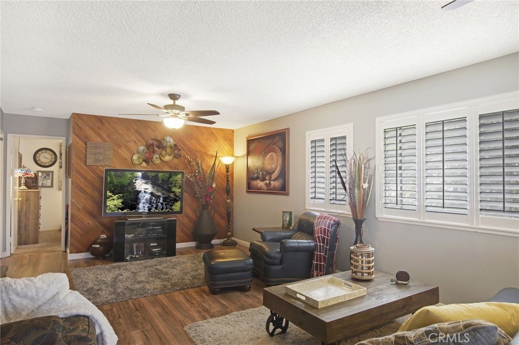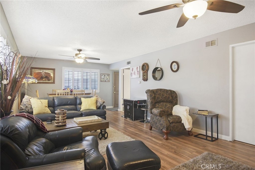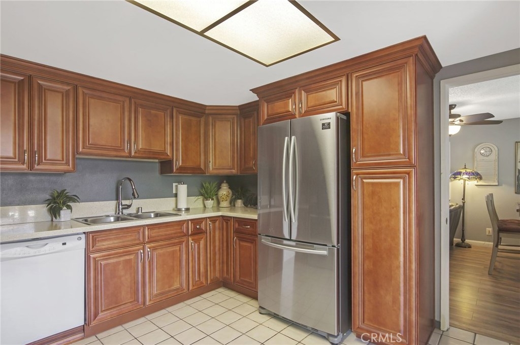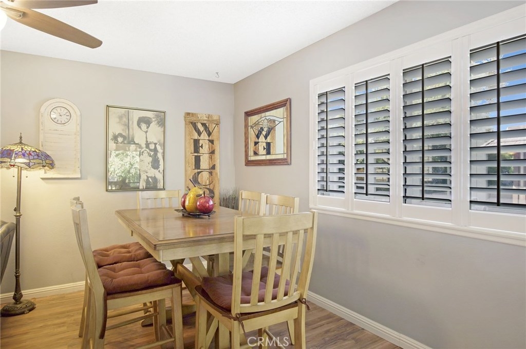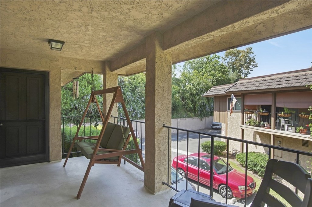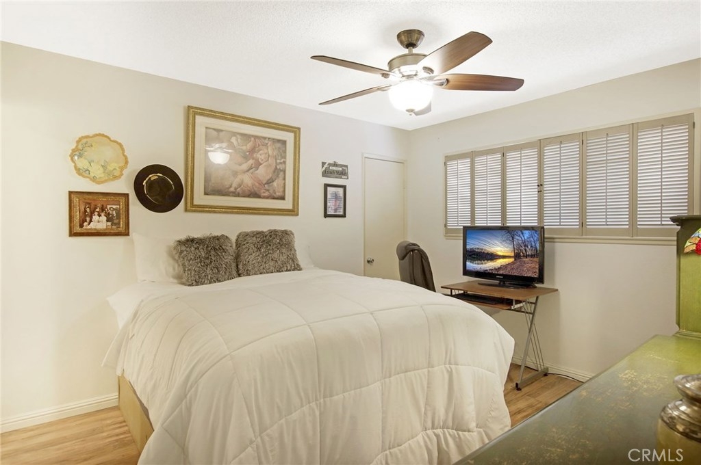 Must see beautifully remodeled and updated Fashion Heights condo! Single story end unit with no one directly above or below. Entirely new luxurious showers in both bathrooms. Fabulous new plantation shutters complete the aesthetic and moderate temperature. New hardwood floors and ceiling fans throughout. The remodeled kitchen has custom cabinetry along with a new French door refrigerator and new stove! Spacious covered patio perfect for a swing or outdoor dining. Laundry room with new top-load washer and dryer is located off of the patio. Entrance to the unit is up the stairs on the second level. One-car attached garage and extra parking space right next to the unit. Fantastic, friendly community with pool, spa and clubhouse. Close to good schools, Performing Arts Center, Sprouts, Trader Joe's & tons of retail, public transportation, cinema and Vista Grande Park (which the City of La Habra has on its agenda for upcoming improvements).