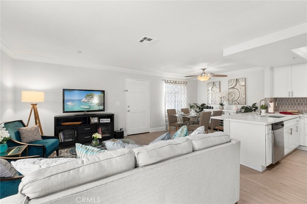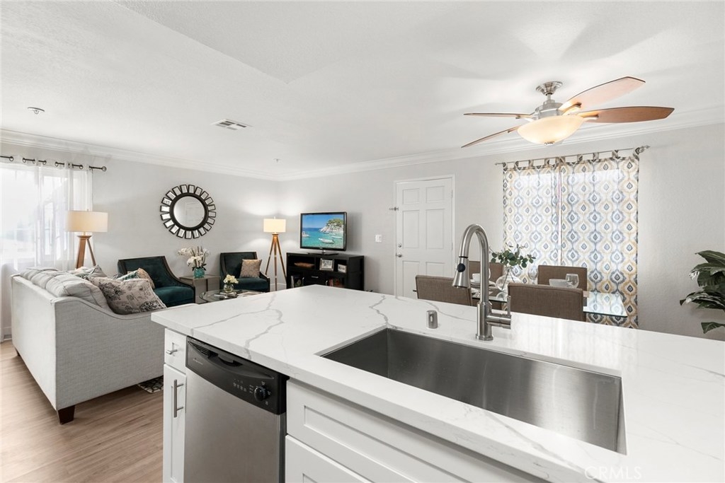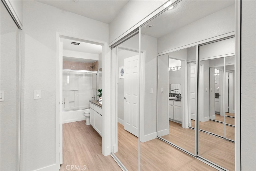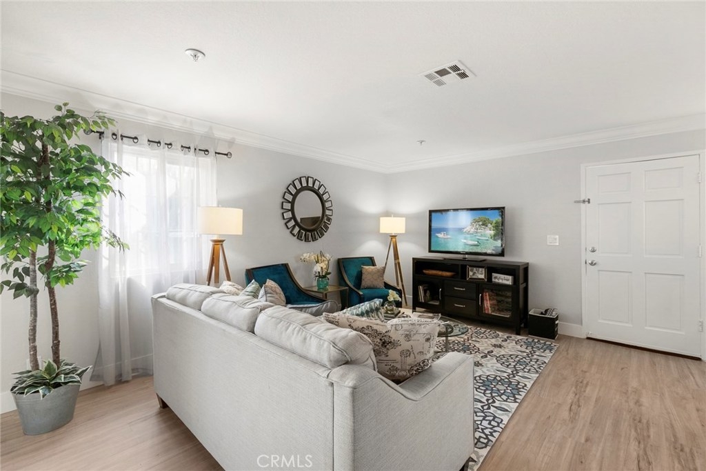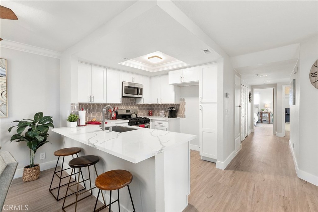 This beautiful and clean end unit home has been renovated and ready to move in. Boasting a newly remodeled kitchen, new LVP flooring and fresh paint throughout the entire unit. The updated kitchen features a new quartz countertop large peninsula that functions as a breakfast bar while providing tons of work space. Cooking will be a joy with the new stainless oven/stove and built in microwave that are showcased in bright new cabinets. Open floorplan living, dining and kitchen makes it perfect for entertaining. Master bedroom has a lot of natural light and features a private balcony plus his and her closets with mirrored wardrobe doors. Both master and hall baths have tub shower combos, travertine tiles and a granite countertop. Washer and dryer hookups are in the unit for your easy access. Other 2 bedrooms are good sized with large closets with upgraded mirror doors. Central heating and air for all year comfort. Quaint and quiet community boasts a pool and picnic area. Association dues include water and trash. Fullerton Joint is the award winning designated school district. You will not be disappointed!