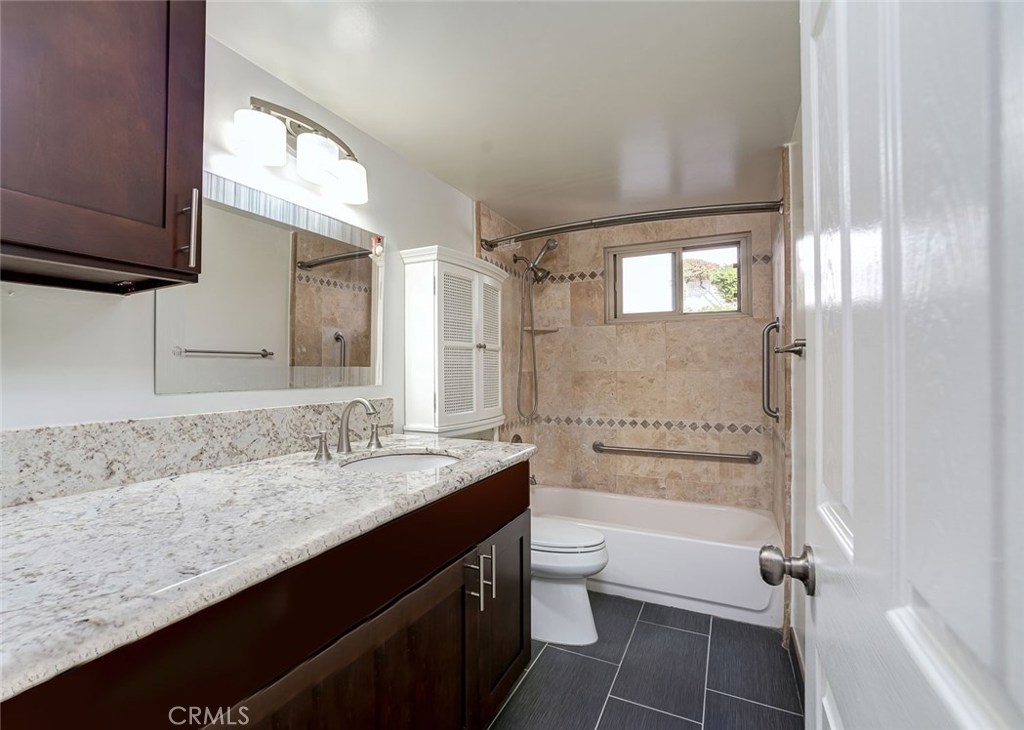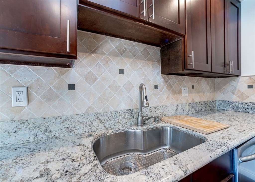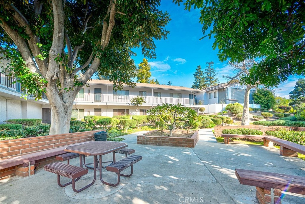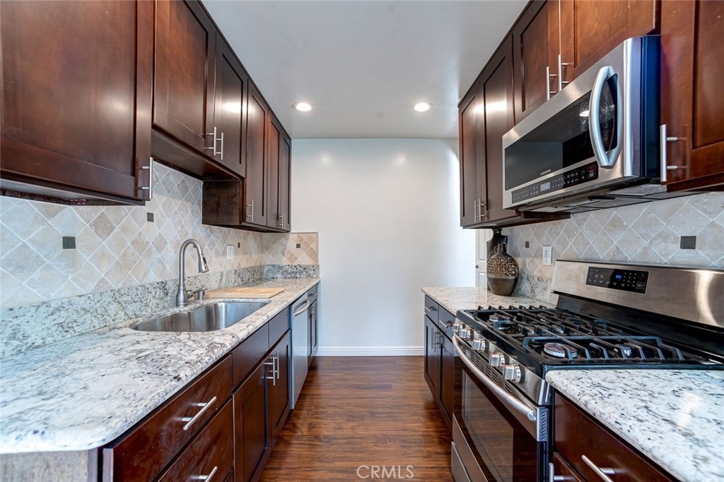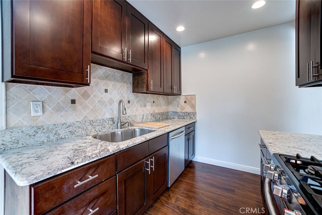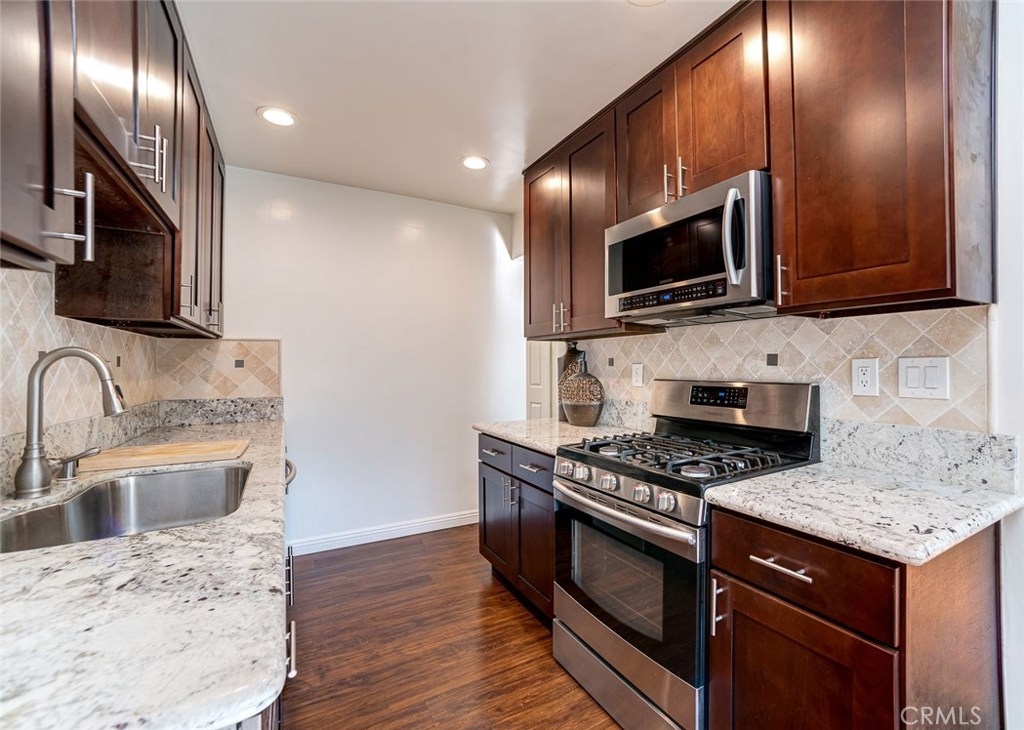 Immaculate, totally remodeled five years ago, light and bright 2 bedroom, 1 bath ground-level condo with a peaceful front view/BBQ area. Located in the beautifully maintained Woodlake Village community, this spacious condo features newer laminate wood floor throughout house and new paint, recessed lighting at living room, rooms ,kitchen and ceiling fan, double pane windows. This super clean home also features granite counters, newer stainless steel dishwasher, gas stove/oven, microwave, newer maple cabinetry. The master bedroom and second bedroom each feature their own large closet. Other upgrades include newer central HVAC unit. Enclosed large patio has nothing above and completely wide open to the beautiful sky. All plumbing pipes were replaced by copper pipes. HOA pays for water, gas, and trash, and also includes outside maintenance, pool, and barbecue areas. Gated assigned carport parking(1 car) plus parking outside. Within walking distance to entertainment, shopping, dining, and theater.