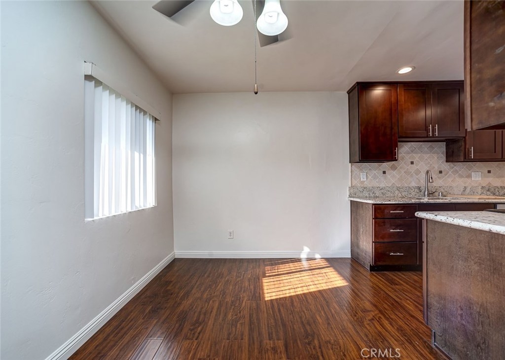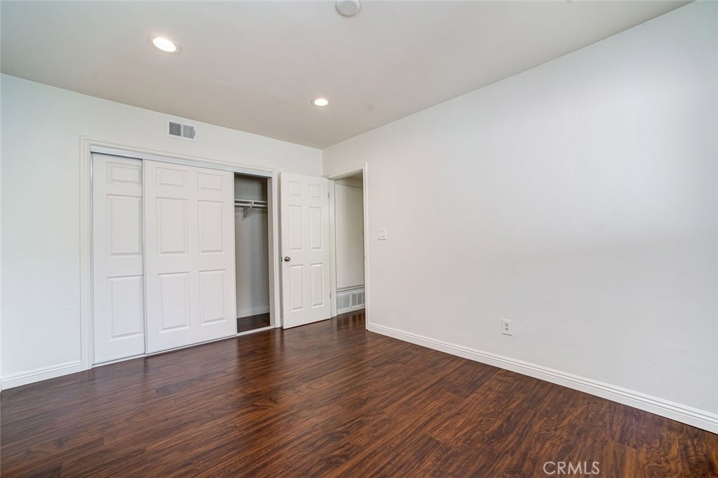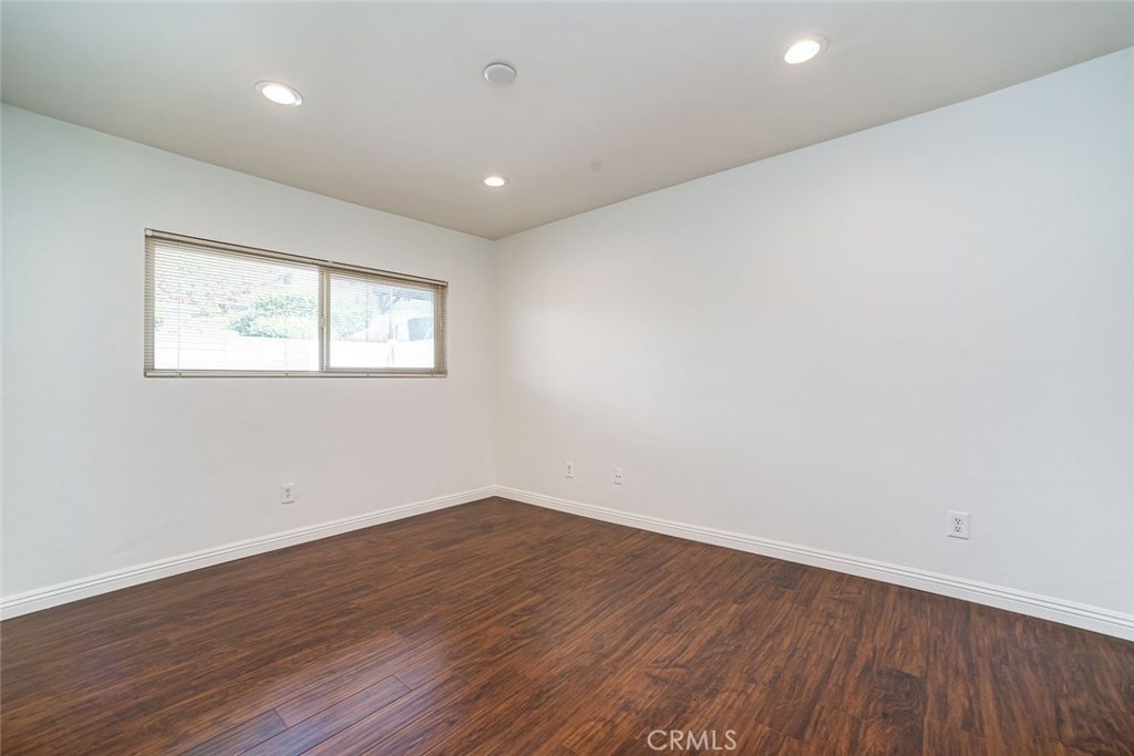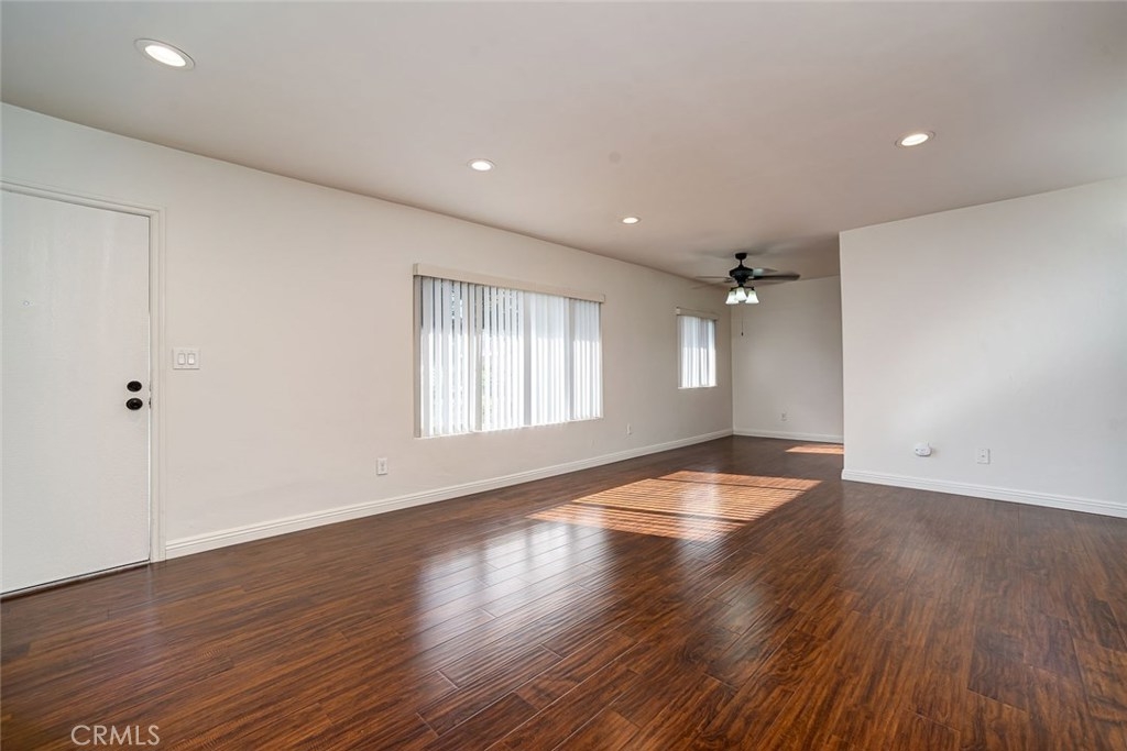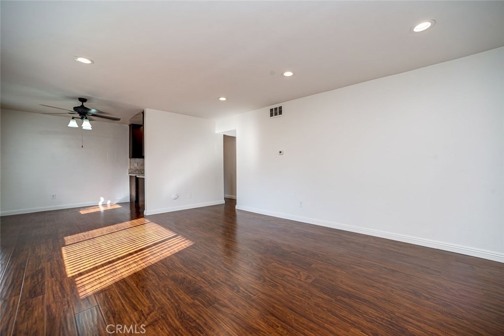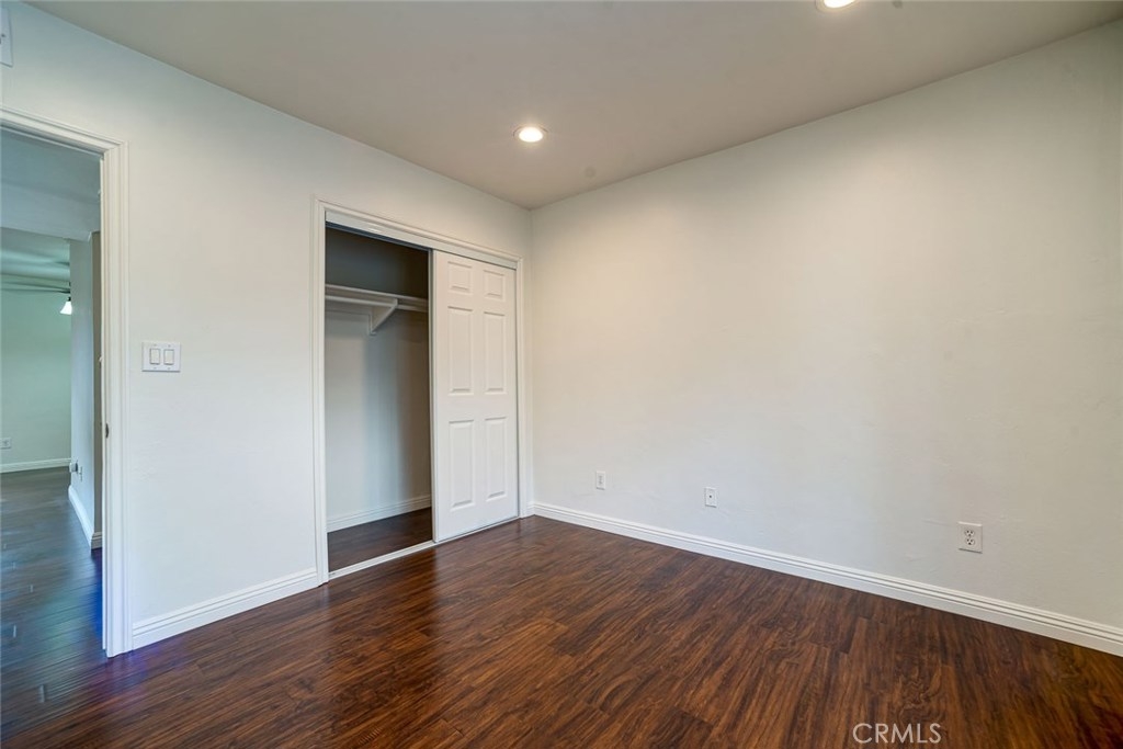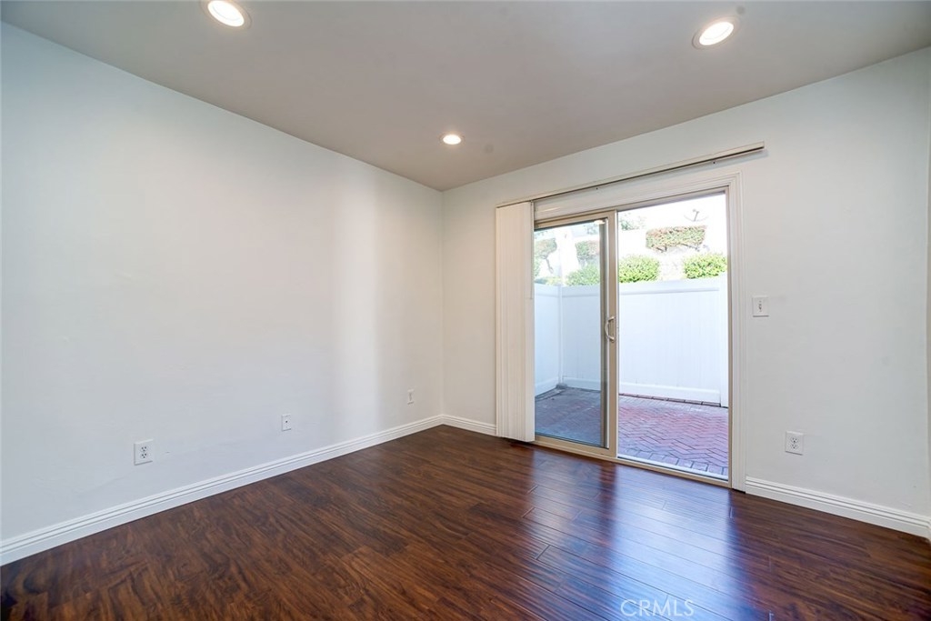 Immaculate, totally remodeled five years ago, light and bright 2 bedroom, 1 bath ground-level condo with a peaceful front view/BBQ area. Located in the beautifully maintained Woodlake Village community, this spacious condo features newer laminate wood floor throughout house and new paint, recessed lighting at living room, rooms ,kitchen and ceiling fan, double pane windows. This super clean home also features granite counters, newer stainless steel dishwasher, gas stove/oven, microwave, newer maple cabinetry. The master bedroom and second bedroom each feature their own large closet. Other upgrades include newer central HVAC unit. Enclosed large patio has nothing above and completely wide open to the beautiful sky. All plumbing pipes were replaced by copper pipes. HOA pays for water, gas, and trash, and also includes outside maintenance, pool, and barbecue areas. Gated assigned carport parking(1 car) plus parking outside. Within walking distance to entertainment, shopping, dining, and theater.