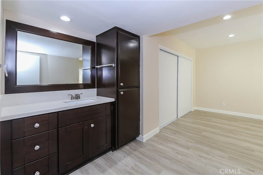You must see this beautifully Remodeled 2BR / 2BA Home in Woodlake Villas. The home is freshly painted, New Air Conditioning, Laminate Wood Flooring, and all newer Dual Pane Windows and Sliding Patio Door. And Kitchen is upgraded with Quartz Counter Top and lots of cabinet spaces. Mastersuite is huge and functional with large closet space and a full bath. And other bedroom is oversized with a large closet and perfect for a growing family. This condo has backyard for your family BBQ and gatherings. The Woodlake Community is very quiet and surrounded by trees and lush landscaping with a Dog/Pet Park and Swimming Pool and Spa area. Don’t miss this opportunity to become a new homeowner in this wonderful surrounding.