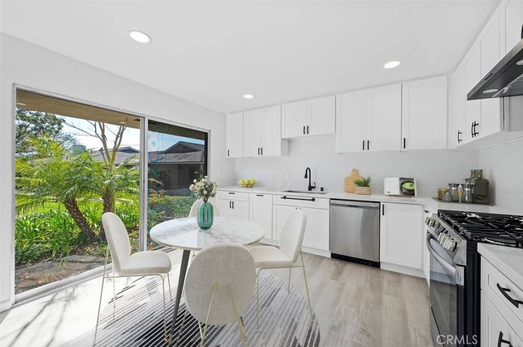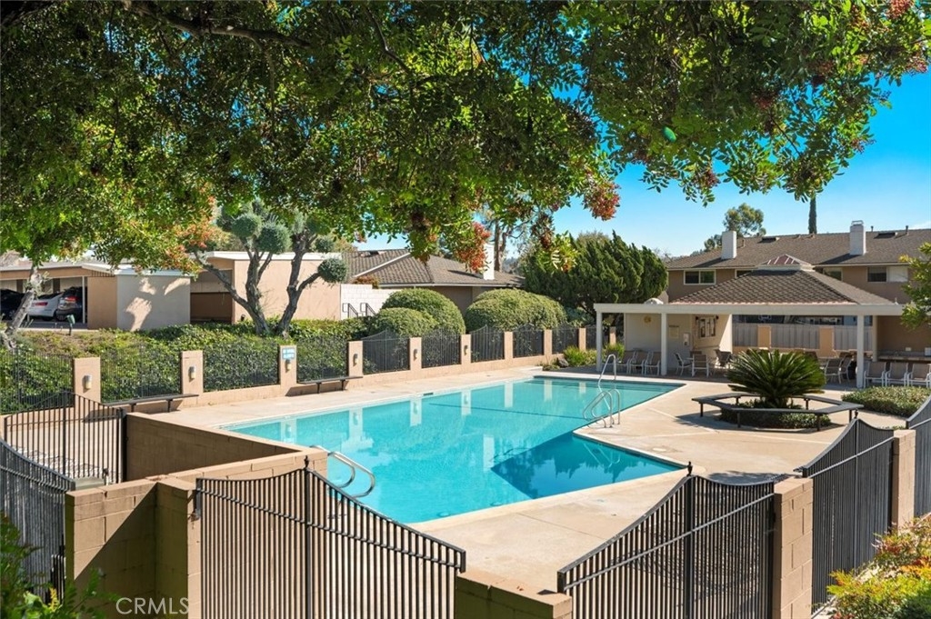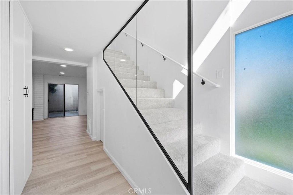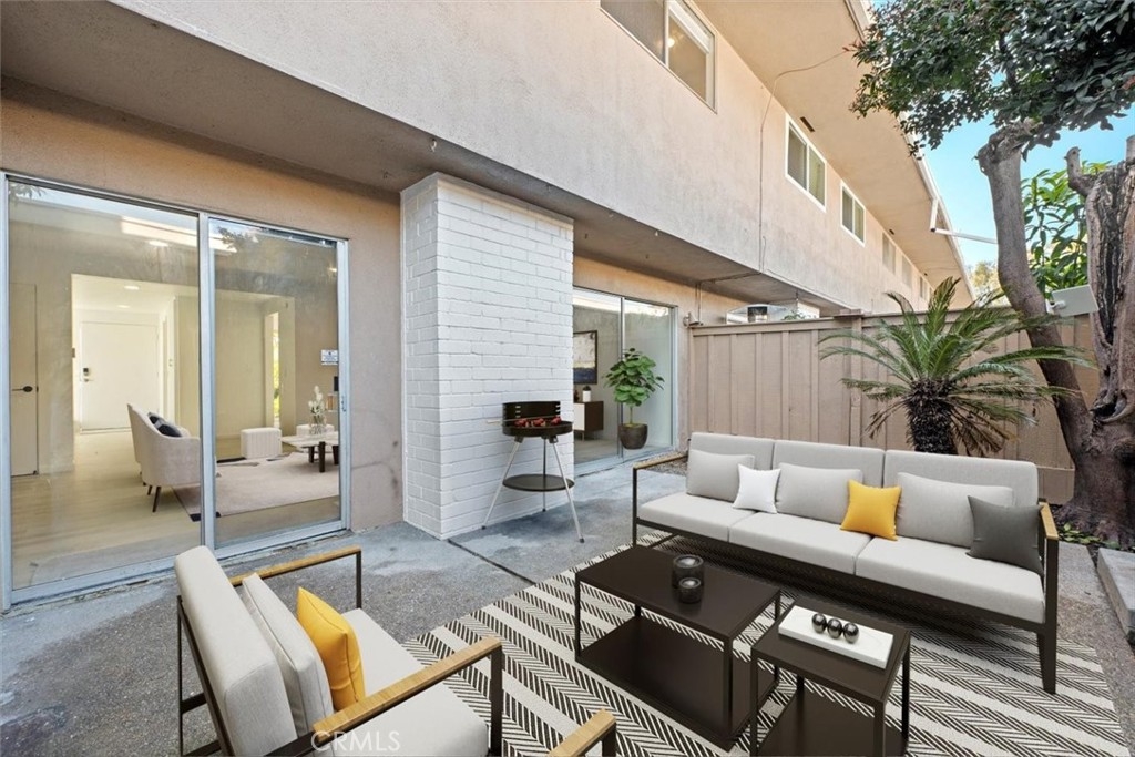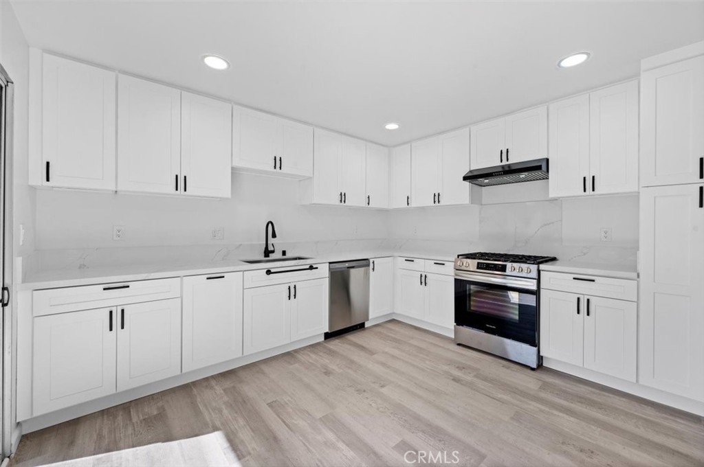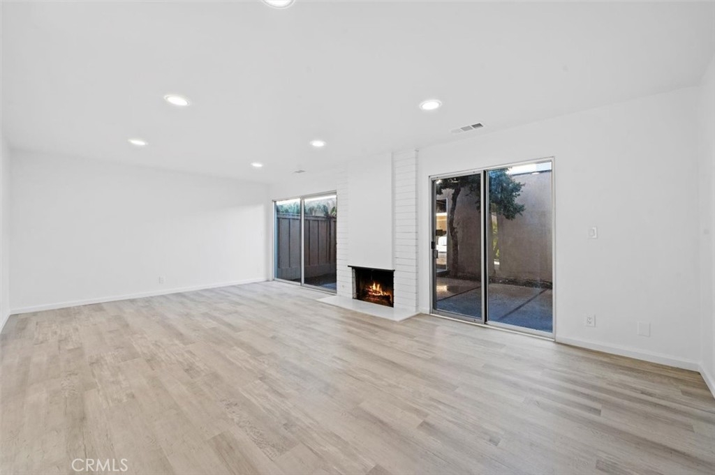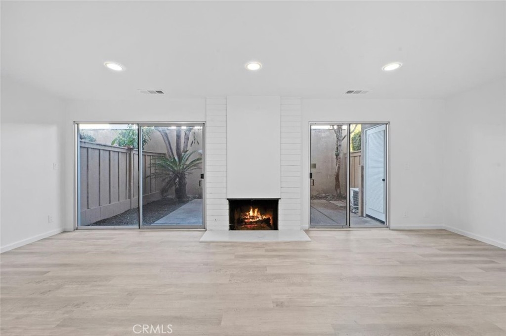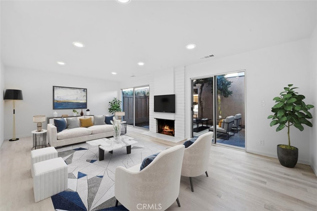 Beautifully remodeled, turnkey mid-century modern end-unit townhouse nestled in the heart of the desired Woodridge Towne House community in La Habra. Step into the home onto brand new New Point Coastal Pine luxury vinyl plank floors which flow throughout the ground floor. The remodeled kitchen features all new quartz countertops, white Shaker-style solid wood cabinets and drawers with matte black handles and pulls, stainless steel Frigidaire gas range and dishwasher, range hood, stainless steel sink with matching matte black faucet, and recessed lights. A large sliding glass door brings in abundant natural light and provides access to the front grounds. The kitchen adjacent great room is spacious and allows for seamless dining and family room space and is highlighted by the centrally located fireplace with brick surround and quartz hearth. The sliding glass patio doors on each side of the fireplace allow for great indoor-outdoor flow from the family room to the private back patio. A half bath and various storage closets adjacent to or below the stairs complete the ground floor. A unique 3/8" tempered glass feature set in a solid bronze channel and pendant lights give the stairway a modern look. Freshly installed gray carpet flows up the stairs, down the hallway with tons of storage space, and into the bedrooms. The primary bedroom suite is large and features two a closets with mirrored closet doors, recessed lights, a ceiling fan, two large windows overlooking the front grounds, and primary bathroom. The primary bathroom features single vanity with quartz countertop, standup shower, and matte black fixtures. The hall bath features a single vanity with quartz countertop and shower over tub with matching matte black fixtures. Bedrooms 2 and 3 feature recessed lights, ceiling fans, mirrored closet doors and windows with a pool view. Located in the back patio is the laundry closet with hookups for a stackable washer and gas dryer. The open air private back patio affords for comfortable outdoor living and is situated between the back of the unit and the private direct door accessible carport with bonus storage. In addition to the dedicated carport space, there is abundant nearby resident and guest parking. The community features a sparkling swimming pool, picnic areas, and community laundry rooms. Conveniently located near restaurants, shops, and more. Move-in ready! What more can you ask for? Do not wait! Hurry before it's gone!