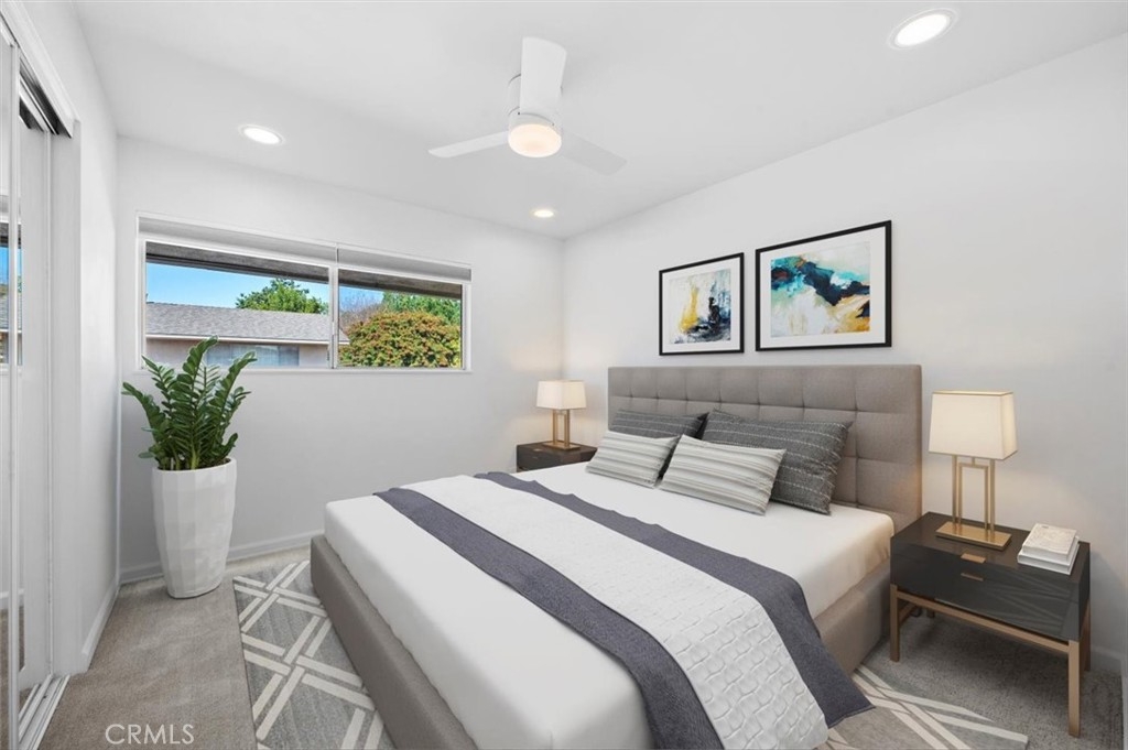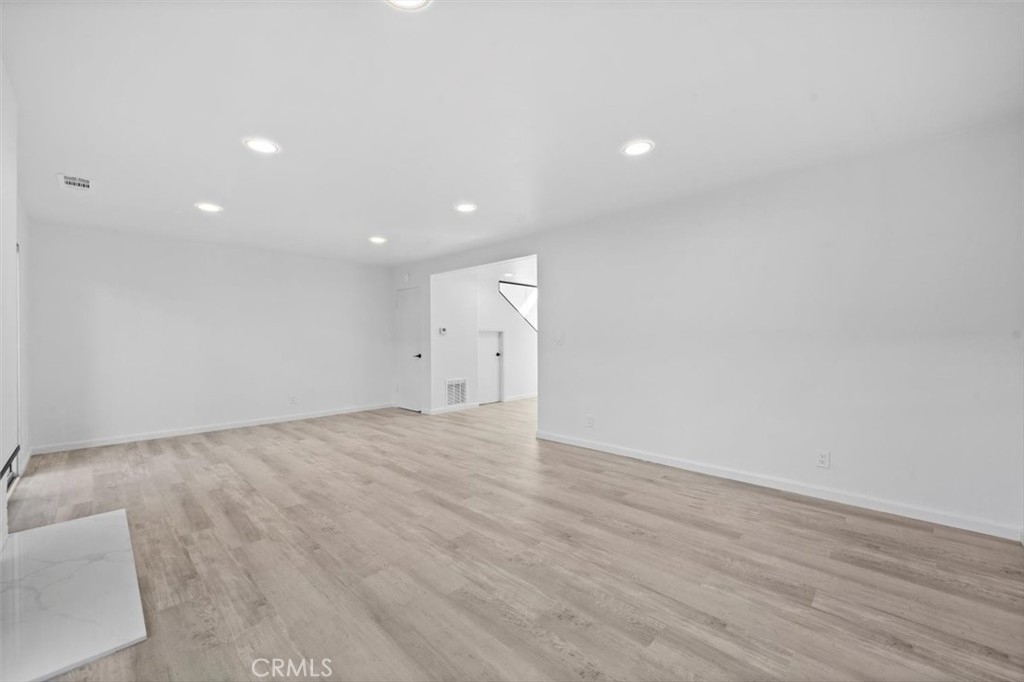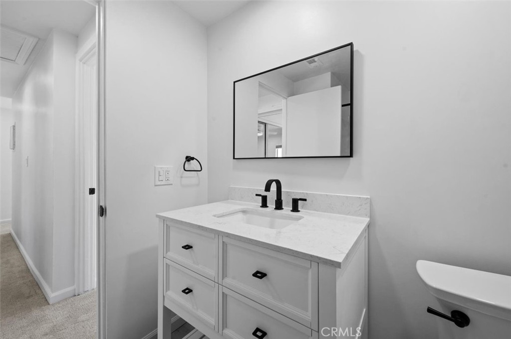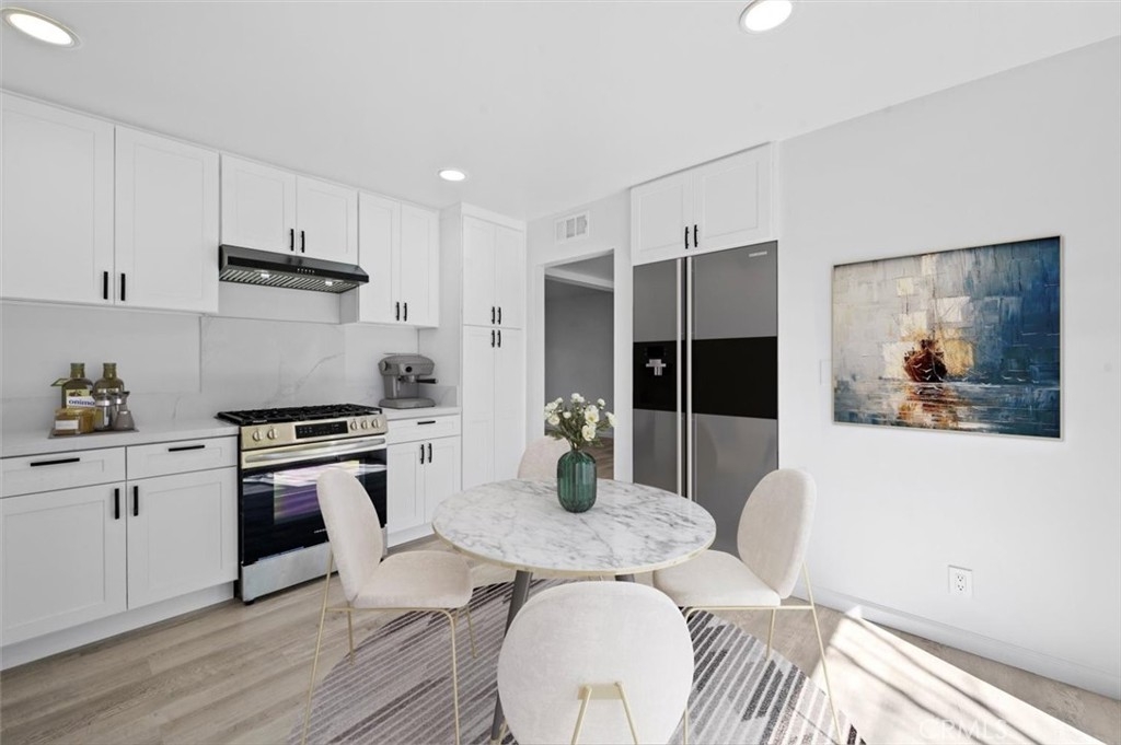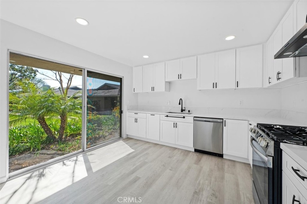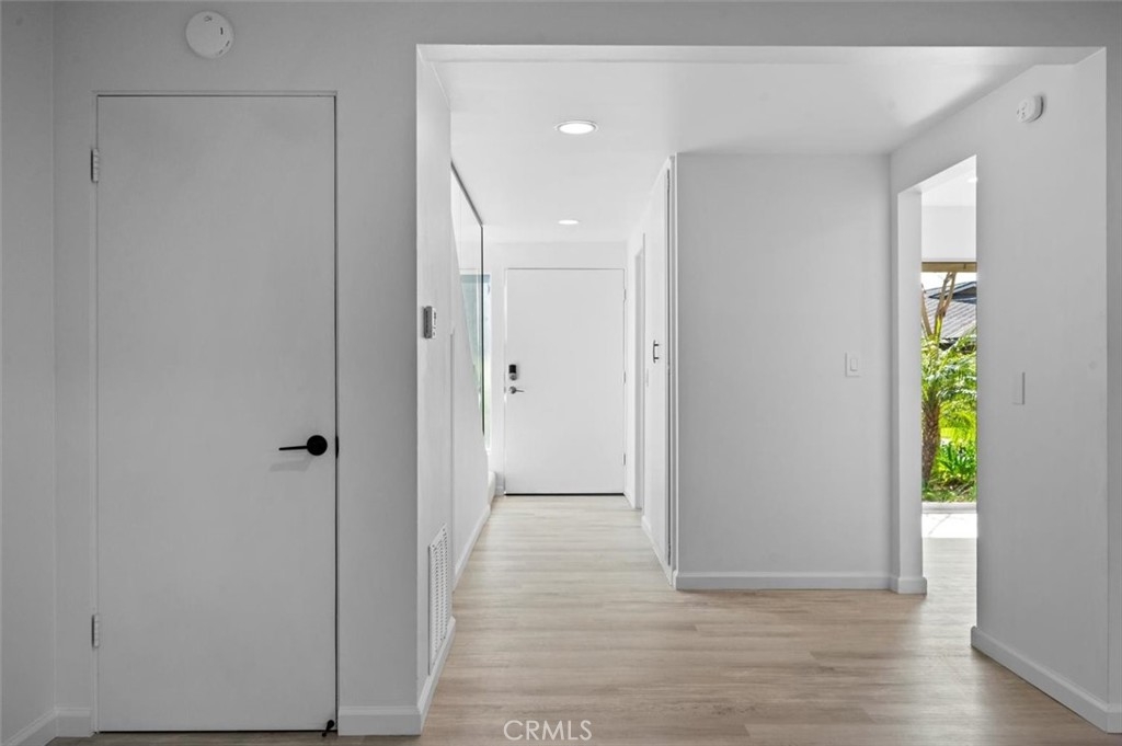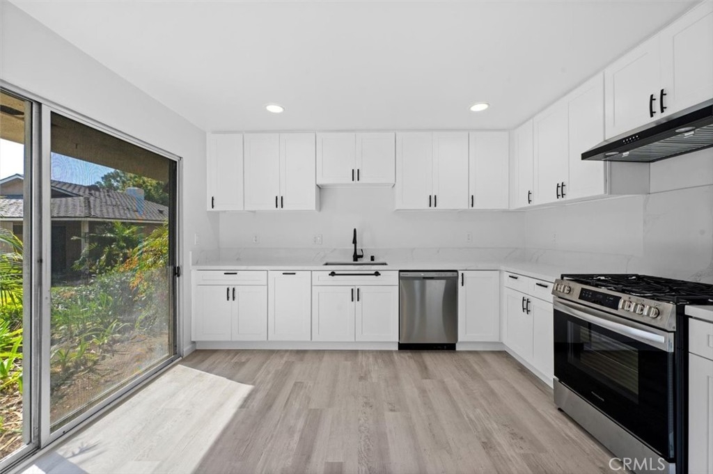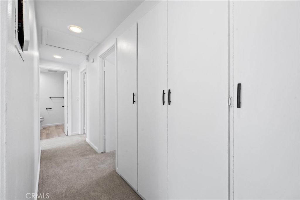Beautifully remodeled, turnkey mid-century modern end-unit townhouse nestled in the heart of the desired Woodridge Towne House community in La Habra. Step into the home onto brand new New Point Coastal Pine luxury vinyl plank floors which flow throughout the ground floor. The remodeled kitchen features all new quartz countertops, white Shaker-style solid wood cabinets and drawers with matte black handles and pulls, stainless steel Frigidaire gas range and dishwasher, range hood, stainless steel sink with matching matte black faucet, and recessed lights. A large sliding glass door brings in abundant natural light and provides access to the front grounds. The kitchen adjacent great room is spacious and allows for seamless dining and family room space and is highlighted by the centrally located fireplace with brick surround and quartz hearth. The sliding glass patio doors on each side of the fireplace allow for great indoor-outdoor flow from the family room to the private back patio. A half bath and various storage closets adjacent to or below the stairs complete the ground floor. A unique 3/8" tempered glass feature set in a solid bronze channel and pendant lights give the stairway a modern look. Freshly installed gray carpet flows up the stairs, down the hallway with tons of storage space, and into the bedrooms. The primary bedroom suite is large and features two a closets with mirrored closet doors, recessed lights, a ceiling fan, two large windows overlooking the front grounds, and primary bathroom. The primary bathroom features single vanity with quartz countertop, standup shower, and matte black fixtures. The hall bath features a single vanity with quartz countertop and shower over tub with matching matte black fixtures. Bedrooms 2 and 3 feature recessed lights, ceiling fans, mirrored closet doors and windows with a pool view. Located in the back patio is the laundry closet with hookups for a stackable washer and gas dryer. The open air private back patio affords for comfortable outdoor living and is situated between the back of the unit and the private direct door accessible carport with bonus storage. In addition to the dedicated carport space, there is abundant nearby resident and guest parking. The community features a sparkling swimming pool, picnic areas, and community laundry rooms. Conveniently located near restaurants, shops, and more. Move-in ready! What more can you ask for? Do not wait! Hurry before it's gone!
