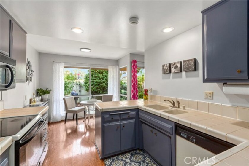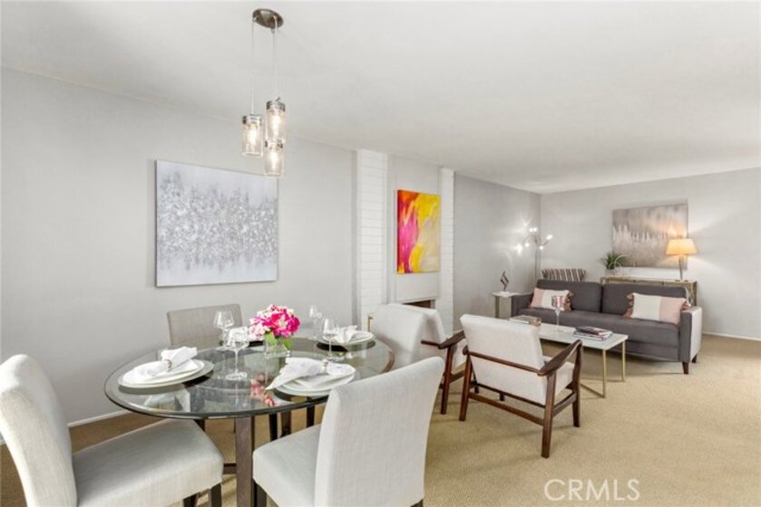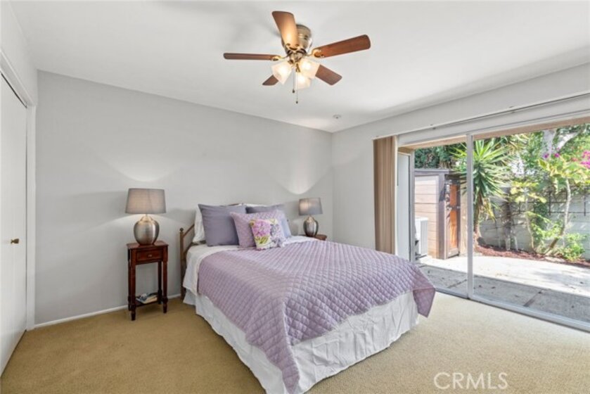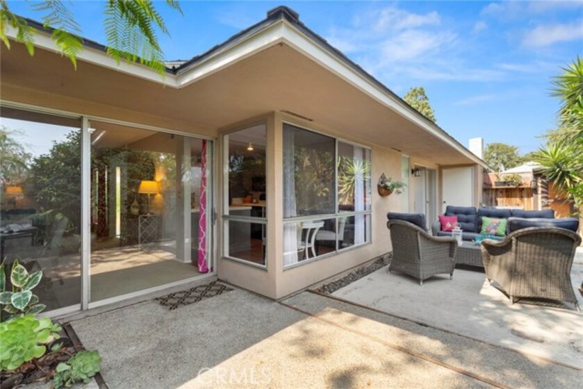 A hidden mid-century modern gem awaits within the lush enclave of Woodridge, La Habra. 983 Glencliff Street is an END UNIT PUD and exudes an understated cool 60’s style, with impressive roof eaves and large windows and sliding doors allowing in ample natural light. A private and lushly landscaped front entry/porch welcome you home and inside to a deceptively spacious interior. A freshly painted interior awaits affording a move-in ready opportunity. The spacious living and dining rooms flow seamlessly together with an impressive fireplace highlighting the living room and a massive 10 foot sliding door in the dining room leading to the backyard/patio. The refreshed kitchen offers stylish painted cabinetry, tile counters and all appliances including a SS fridge. The kitchen eating nook overlooks the lush rear patio with nearly floor to ceiling windows. Down the hall you’ll find a beautifully preserved hall bathroom and comfortably sized secondary bedroom. The master suite offers a vanity area with linen closet, ample closet space and another large sliding door to the backyard. Newer glass shower doors and window in the master bathroom too! The backyard is a true private sanctuary with mature trees and lush green foliage, a custom storage shed is ideal for yard tools & a stackable washer/dryer closet. The enviable location enjoys a large greenbelt to the side and private gate from the patio out, steps to the covered carport. Enjoy all of this w/in steps of shopping, dining & golf