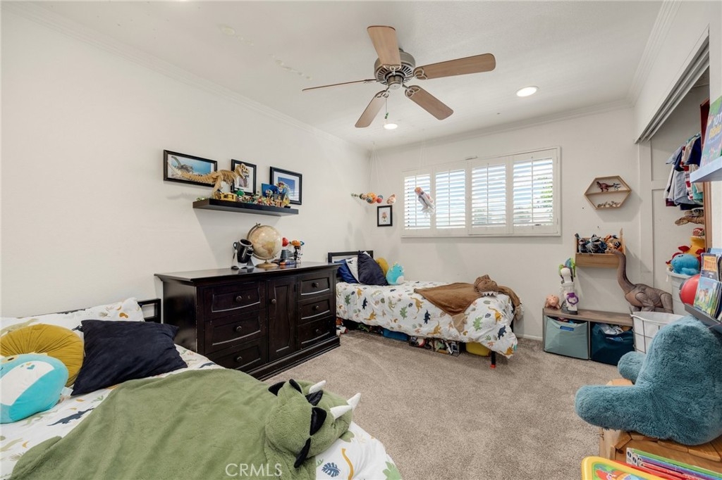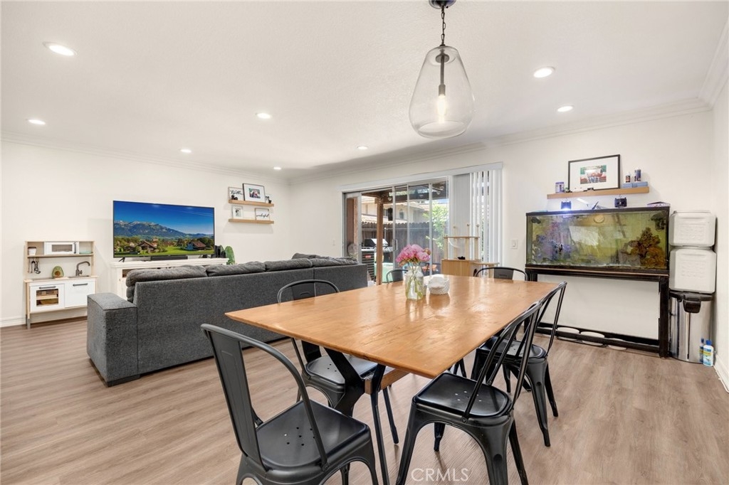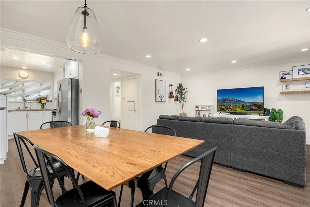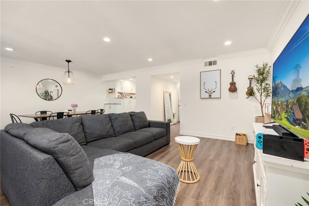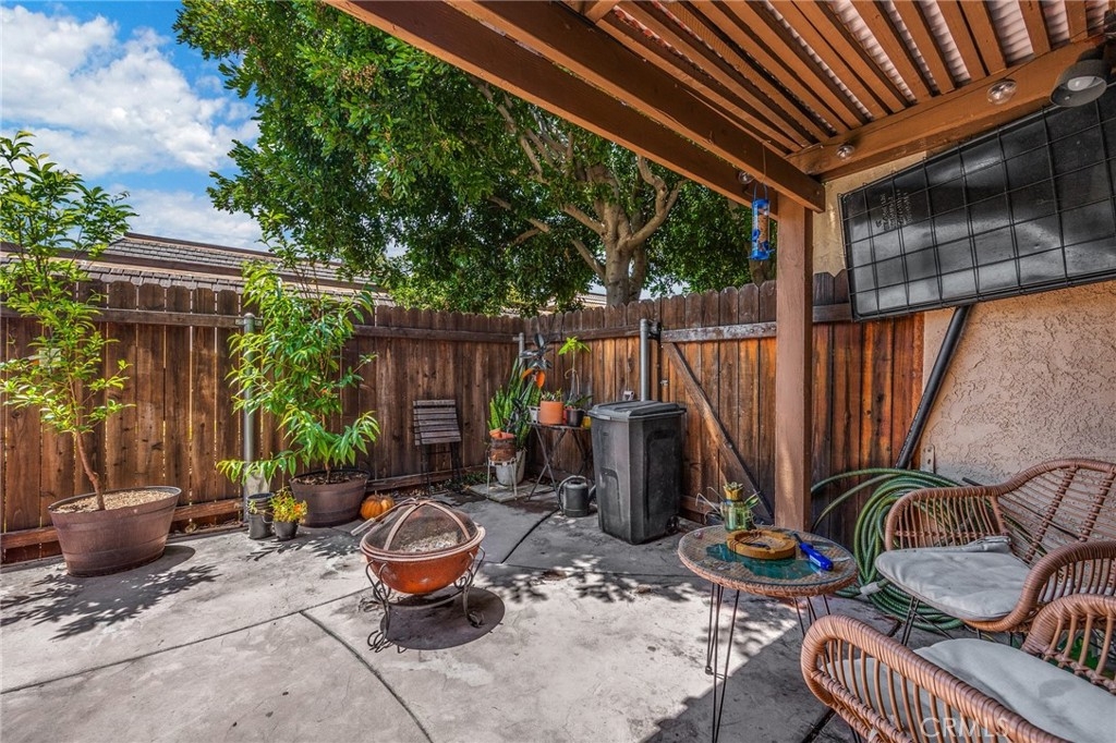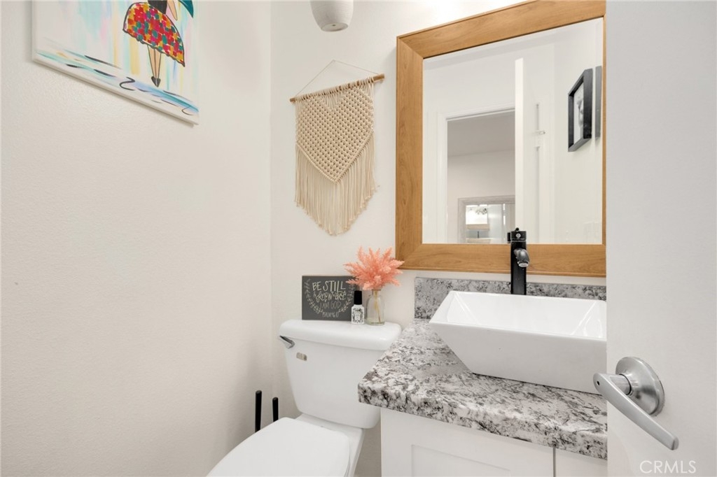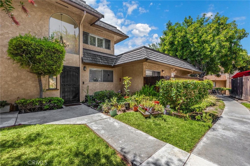 Beautiful and tastefully upgraded 2 story condo with a private low maintenance patio. Upgrades include highly desired waterproof flooring throughout the downstairs, recessed LED lighting, a gorgeous kitchen, completely remodeled with custom cabinetry and beautiful granite counter tops. The details of the kitchen include, soft close doors and drawers, a cabinet designed specifically for your washer and dryer, a corner cabinet complete with a lazy susan, and a stainless steel stove and hood vent. The downstairs bathroom has also been updated and includes a new vanity with granite countertop. There is extended storage in the closet below the stairs. Upstairs in the hall, you'll find more cabinet space for linens, two generously sized bedrooms and a full bathroom with a jetted tub. You'll be sure to appreciate the space the Primary suite offers, including a walk-in closet with organizers, waterproof linoleum flooring and wood shutters. The hall and secondary bedroom are carpeted, this bedroom is very spacious, with a large closet and wood shutters. This unit has a one car garage with two remotes and an assigned parking space. HOA's covers, water, sewer and trash. Fashion Walk community is conveniently located near the La Habra Market Place, where there are lots of stores, restaurants and even a movie theater. Planned project underway across the street from this community is to expand Vista Grande Park.