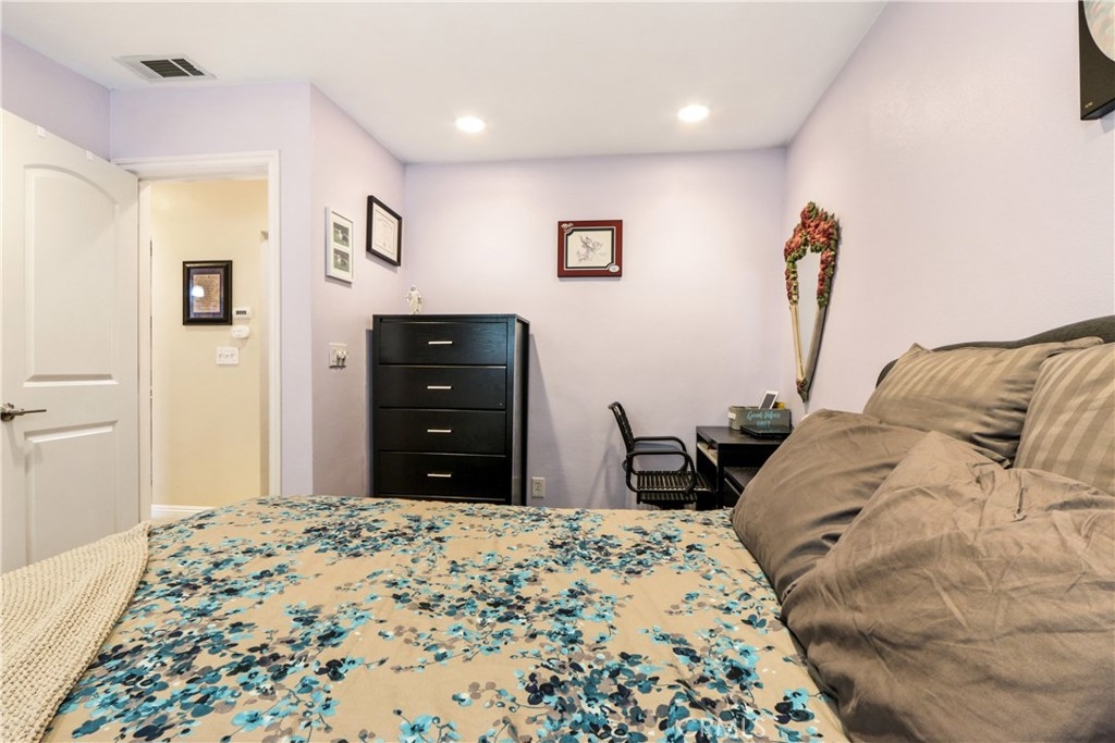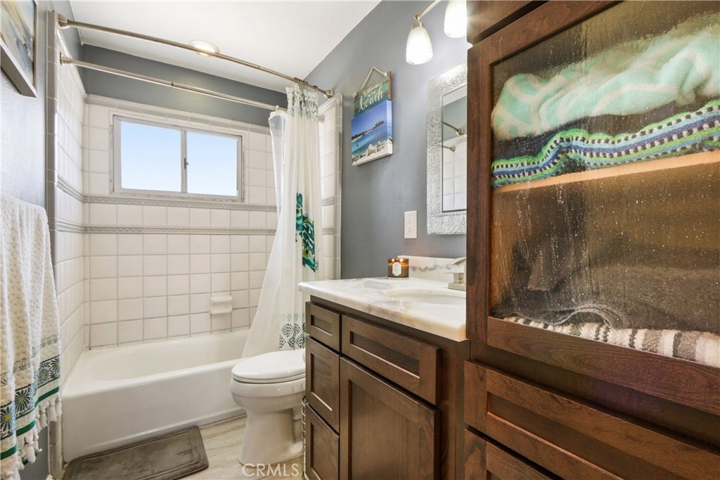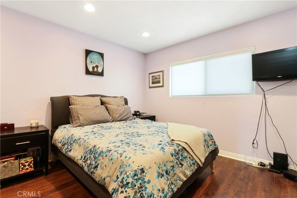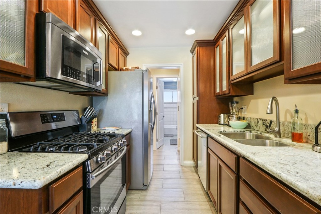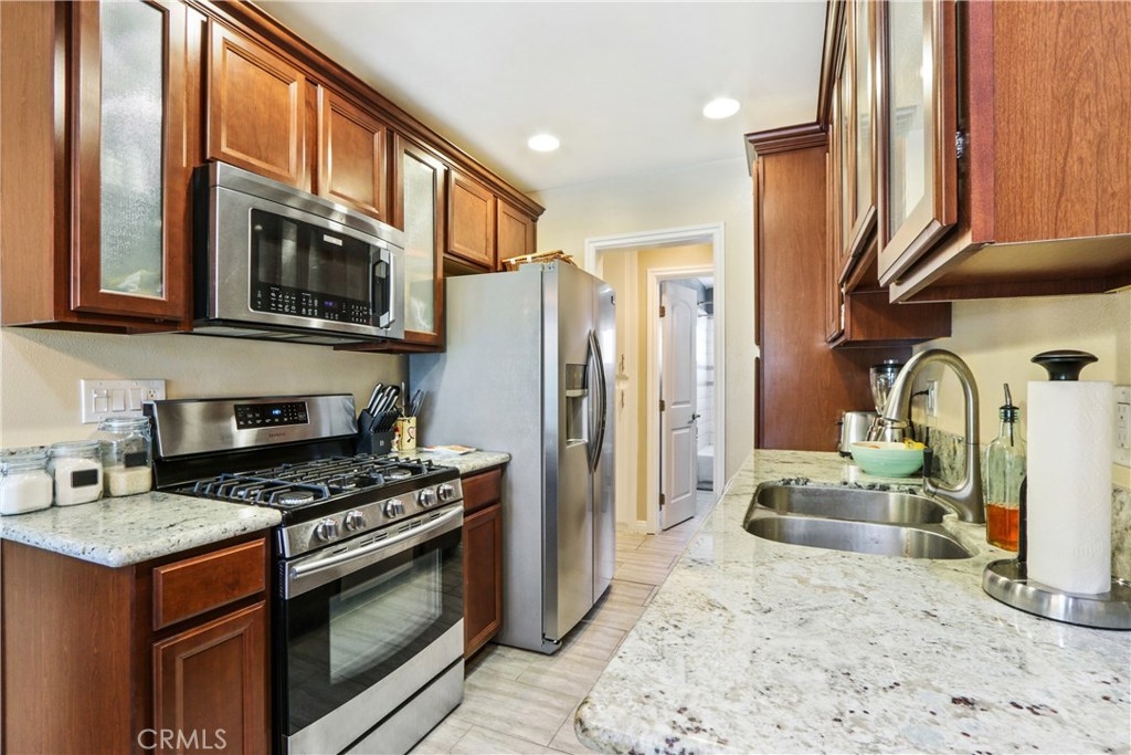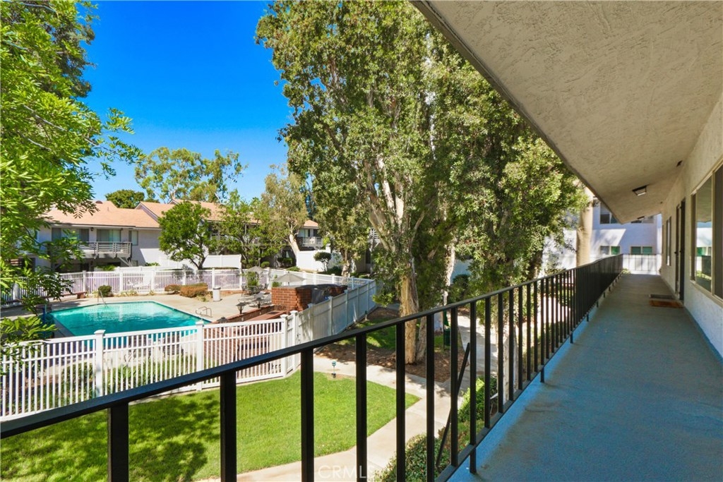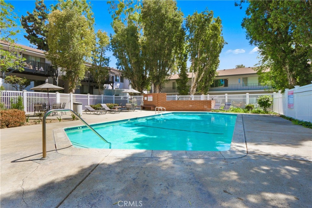 Come home to this beautifully remodeled condo at Woodlake Village! Good sized open family room and dining room combination with gorgeous engineered hardwood floors. Soft gray large subway tiles on floors in kitchen and bathroom. Granite counters, stainless steel sink and Electrolux appliances, frosted glass front cabinetry with soft close drawers and matching hardware. Bathroom has tiled shower with designer inlay, storage cabinets that match kitchen cabinets with frosted glass fronts as well and marble countertop on vanity complete the look of this spa like space. Bedroom is oversized with an alcove space for an office, music studio or game room. New windows throughout the home have been added. Pool view with lots of trees and greenery make this space relaxing and peaceful. The pool and bbq area are a stones through away for you to take full advantage of on those hot days! Central heating and AIR!! Complex is FHA approved! Fantastic area of La Habra next to shopping, restaurants and more! Make this one yours before it's gone!!