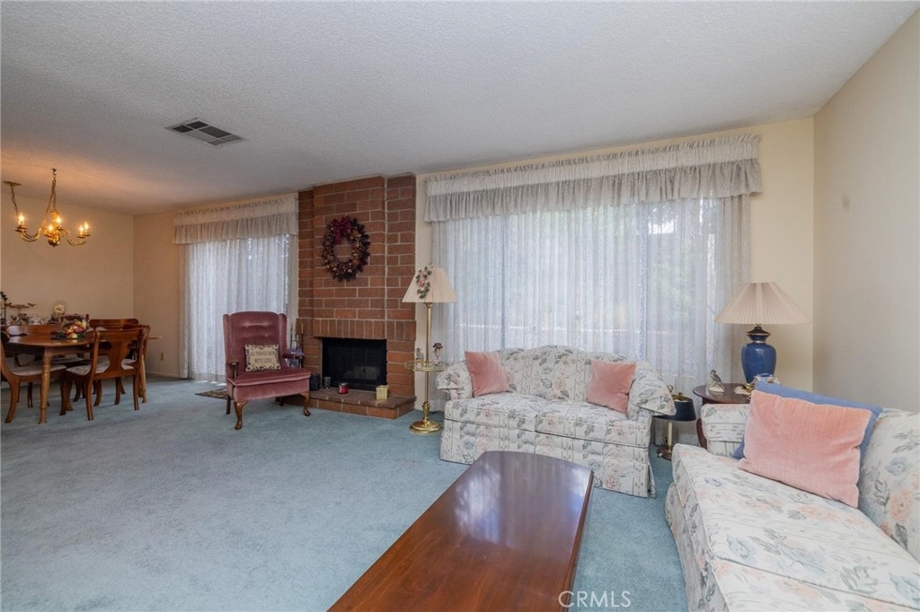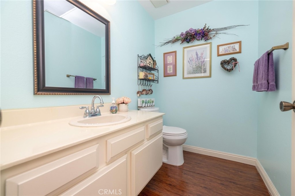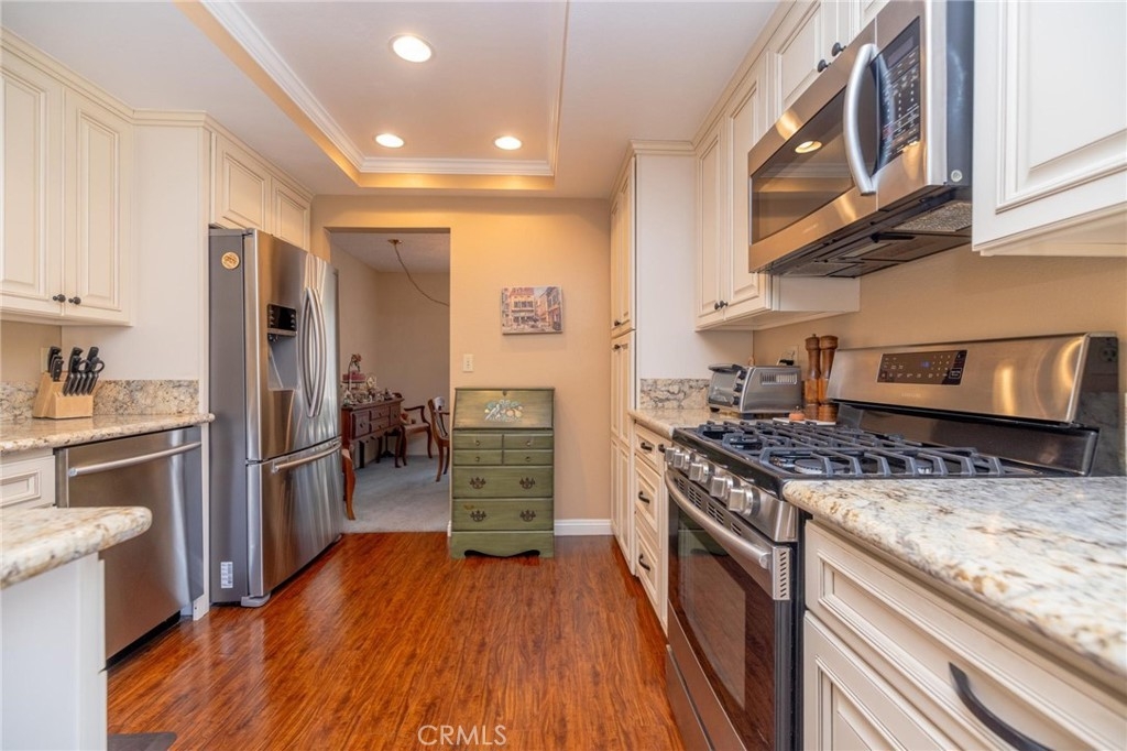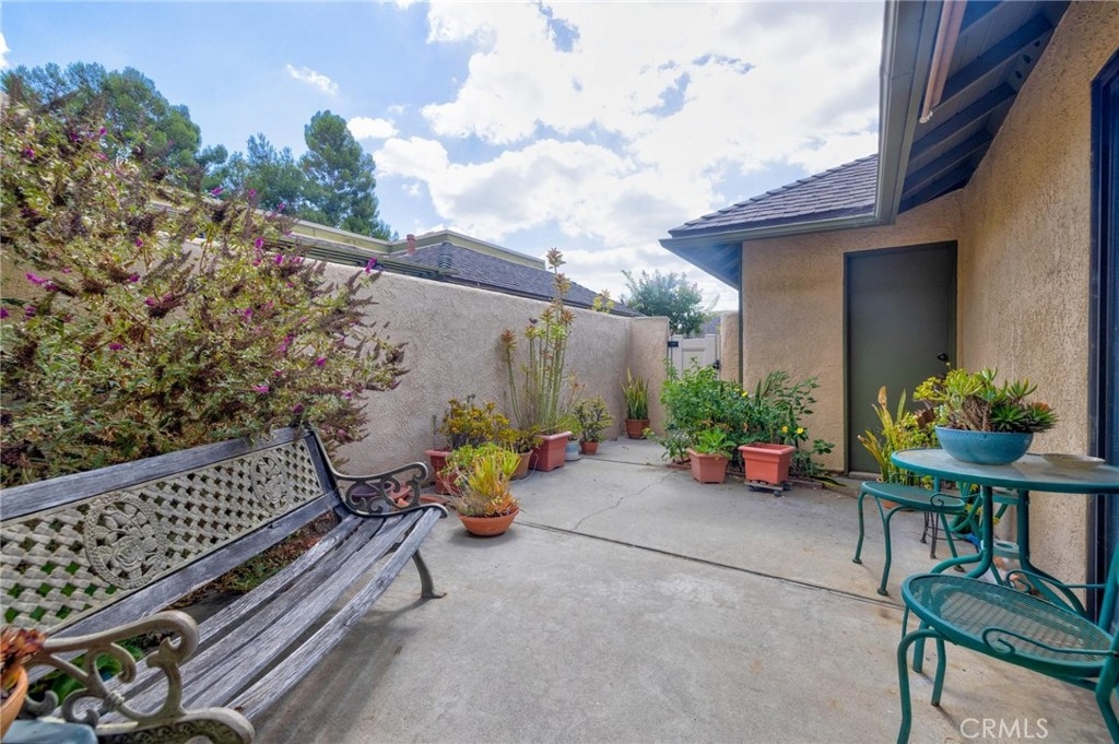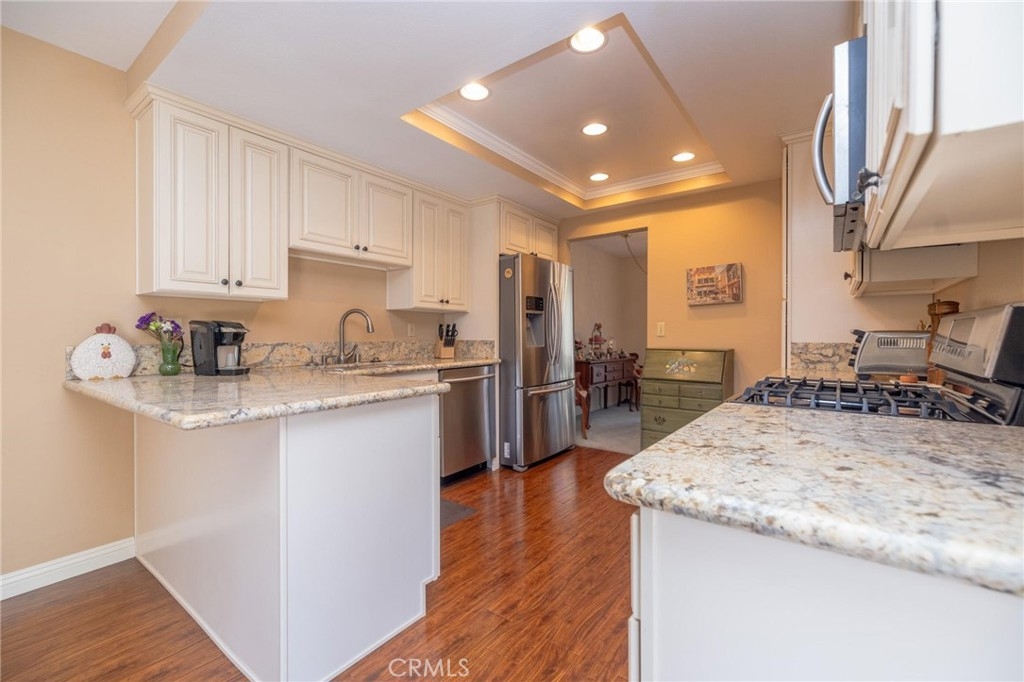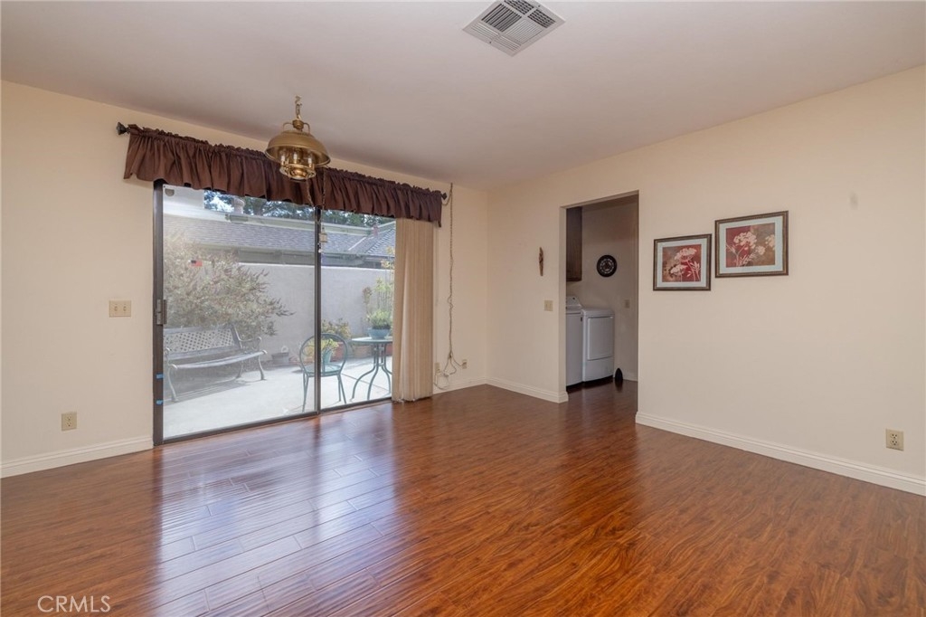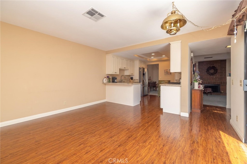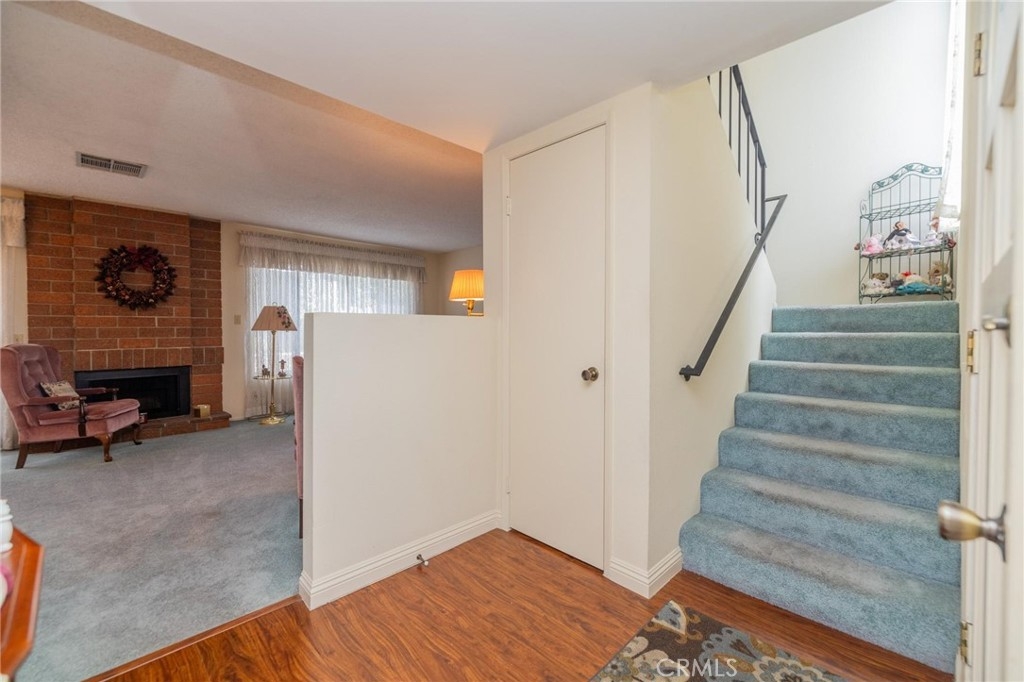 This 1,476 sq.ft. 2 bedroom, 1 1/2 bathroom home in the Heritage Village community will charm you. Enter a private front patio with dappled sunlight and space for gardening. Opening the front door you'll see the spacious light-filled living room with a fireplace. On the left is the kitchen, remodeled with handsome ivory cabinetry and striking granite countertops and breakfast bar in tones of cream and caramel with stainless steel Samsung microwave, gas range, refrigerator and dishwasher. Off the kitchen is a generous open family room with access from sliding glass door to the front patio. There is a downstairs 1/2 bathroom and laundry area. Laminate wood flooring is throughout the kitchen, family room, and laundry area. On the other side of the kitchen is the dining room which has access to the back patio. Upstairs are 2 bedrooms, each with large double door closets. The upstairs bathroom has a new vanity and granite countertop with a double sink and a sparkling new shower. This home has an efficient and warm layout, and is rounded out with an attached garage. The Heritage Village community features a pool, spa, jungle gym and community center with lots of space and its own kitchen.