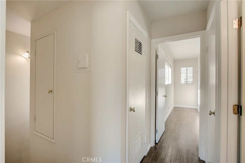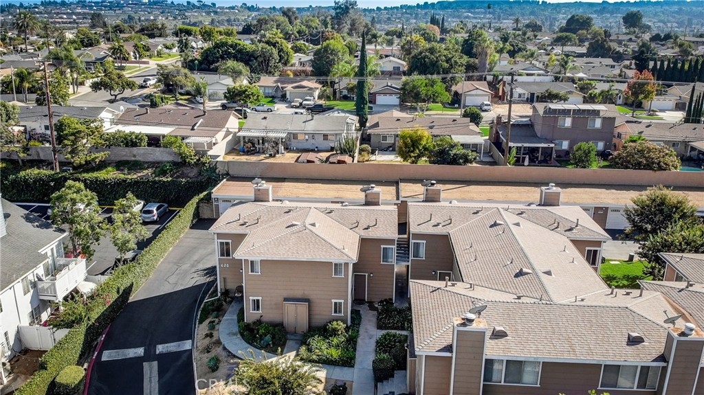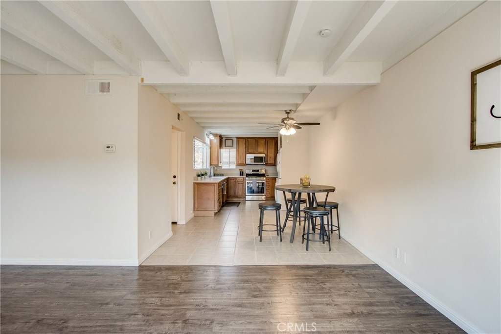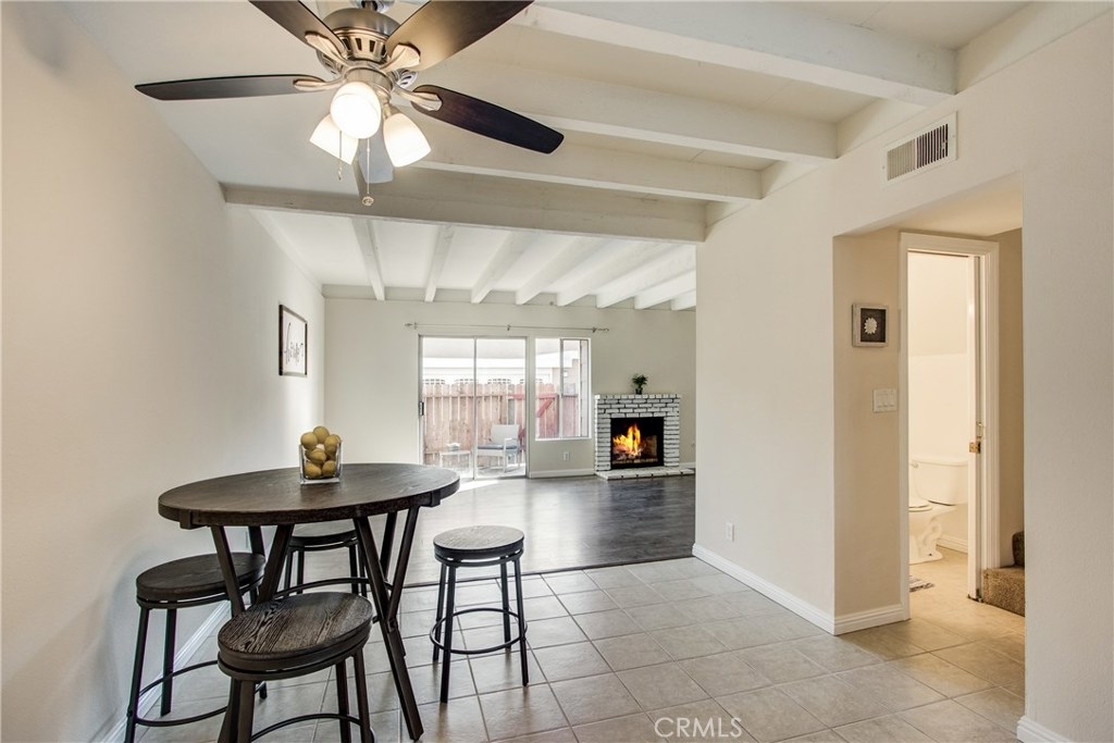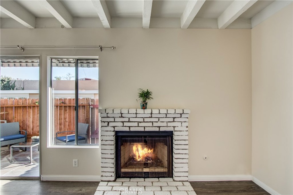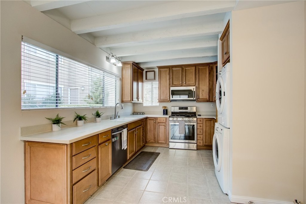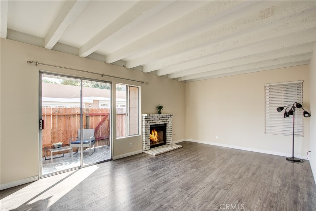 This beautiful North Orange County home features a spacious floorplan, new interior paint with calming earth tones, and wood-like laminate plank flooring throughout! The kitchen offers wooden cabinetry with lots of storage space, newer stainless steel appliances which include a stove, microwave and dishwasher, in-unit stacked washer and dryer laundry area, and opens to the dining room. The large living room offers an abundance of natural light, gorgeous beamed ceilings, a whitewash brick fireplace, and a half-bathroom complete the downstairs. Both of the bedrooms are generously sized, offer lots of natural light and share a full-size bathroom with a granite countertop. This home offers a two-car garage, central A/C, and private back patio. Entertain guests out by the sparkling community swimming pool, and enjoy the well-manicured landscaping that this complex has to offer! This home is conveniently located near schools, shopping, restaurants, and more! Don't wait!
