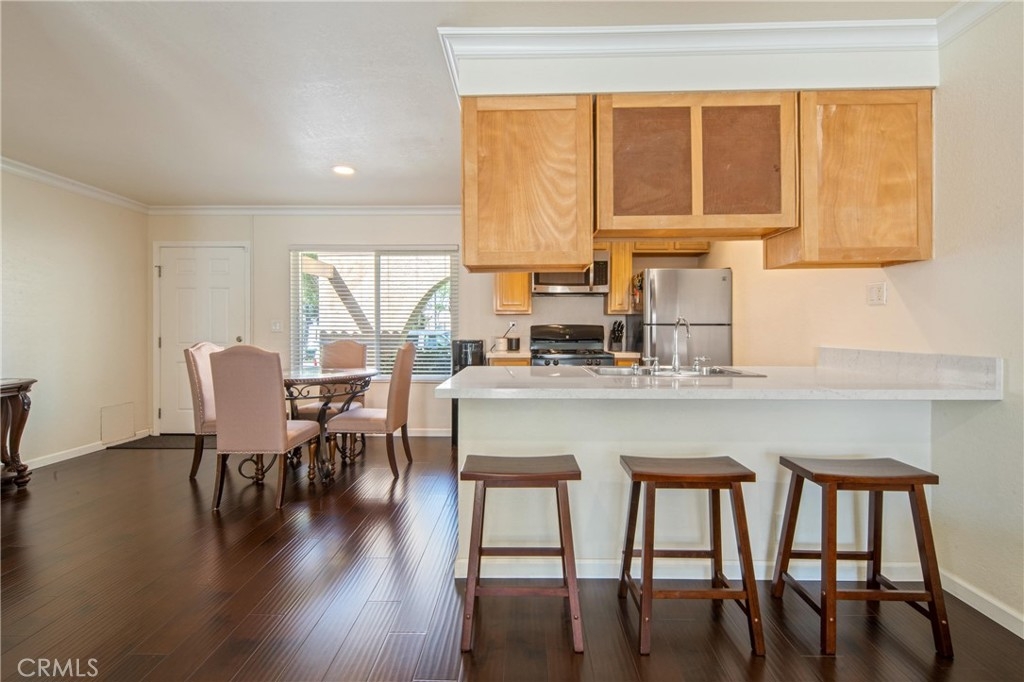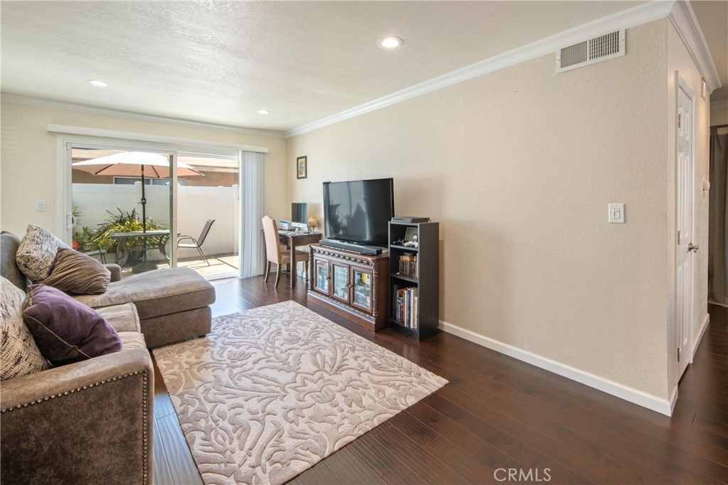 Welcome home to Mira Vista Condominiums in La Habra! This extensively renovated condo features an open floor-plan with a larger back patio. Through out you will find updated dual pane vinyl windows, crown molding, recessed lights and updated laminate floors. The bathroom has porcelain tile floors and a cast iron bathtub. The kitchen features Quartz countertops which extends to the living room. 1 reserved carport parking and storage room. Don’t miss out to call this home!