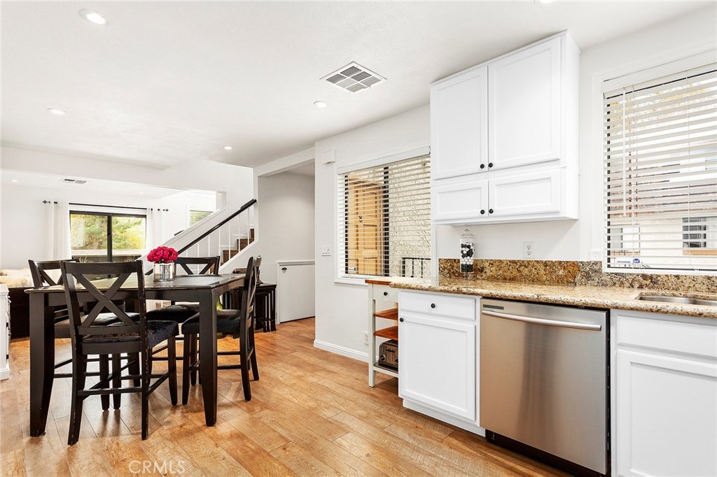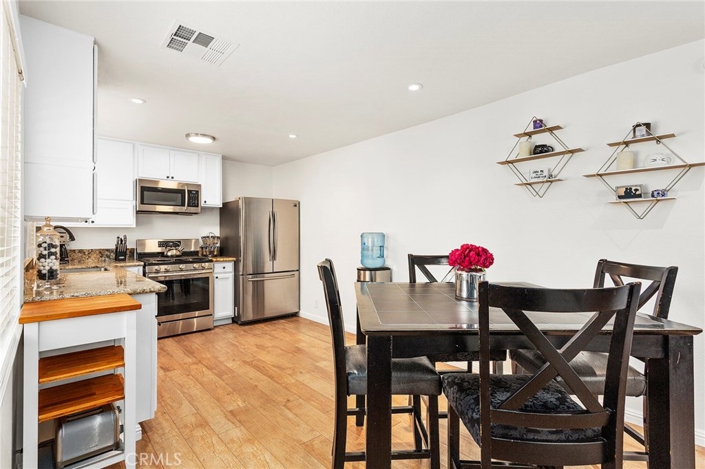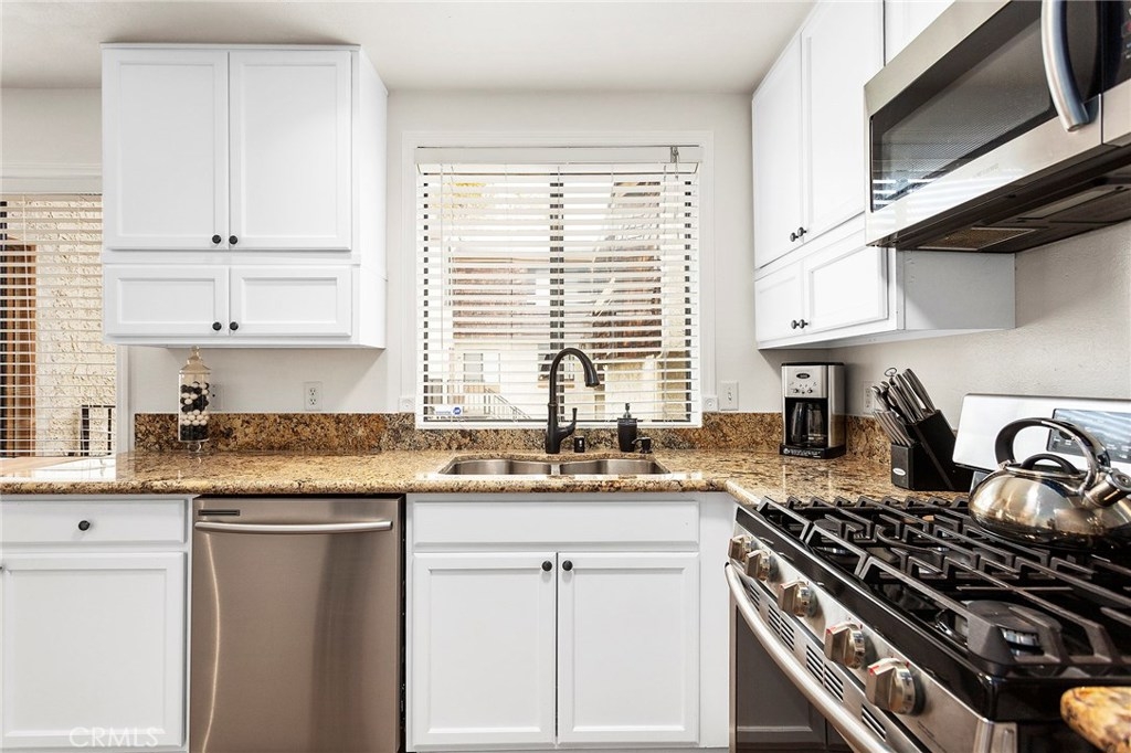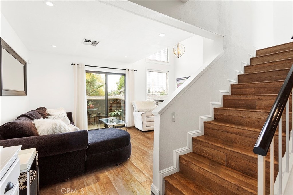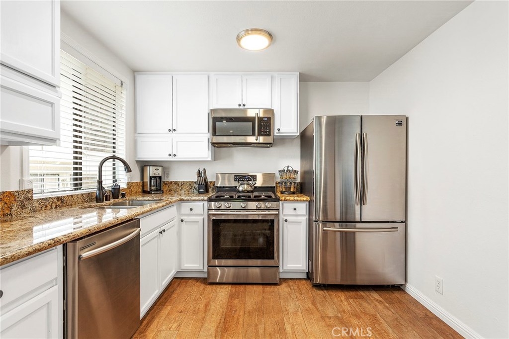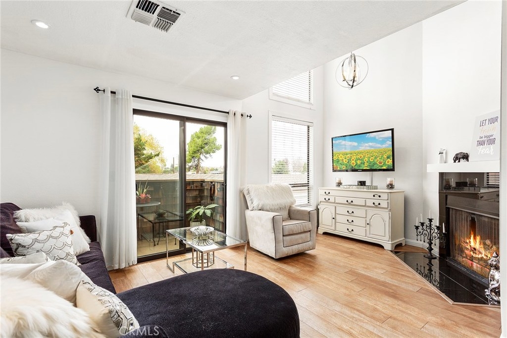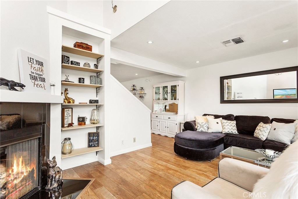 Welcome to Parkside Townhomes in La Habra! This upgraded turnkey end unit has all the bells and whistles. As you enter you are greeted by a stunning kitchen with SS appliances, granite counters and expansive wood laminate flooring throughout! To the right of your entry and kitchen, you will find a half bath and your beautiful living room. The living room has two-story ceilings with tons of natural light, a built-in bookshelf, and a fireplace. Step out of the living room and enjoy some relaxing moments on your private patio. Just up the stairs, you will find a loft-style master retreat, full bath and secondary bedroom with its own private balcony. Your washer and dryer are included and conveniently located upstairs. Enjoy a large two-car garage and all the amenities this community has to offer! Don't wait, let's get your showing set so you don't miss out on this beautiful home!