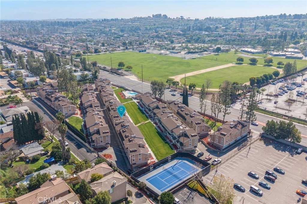 Modern comfort meets everyday convenience in this beautifully upgraded, end-unit condo nestled in one of La Habra’s most desirable communities. With only one shared wall, this home offers added privacy and a light, airy feel throughout. Step inside to discover soaring ceilings and rich dark laminate flooring that create a warm and inviting atmosphere from the moment you enter. The open-concept layout flows seamlessly into a fully renovated kitchen featuring sleek European-style custom cabinetry, including a hidden lazy Susan for added storage and functionality. The spacious island doubles as a breakfast bar and is topped with speckled quartz countertops, complemented by a full suite of stainless-steel appliances including a cooktop, oven, refrigerator, and dishwasher—making this space both stylish and practical for everyday living or entertaining. Upstairs, the spacious primary suite provides a peaceful retreat, complete with an adjoining loft area ideal for a home office, reading nook, or personal gym. The en-suite bathroom has been tastefully remodeled with a floating dual-sink vanity and a luxurious jet shower. The guest bathroom mirrors the same modern finishes with a matching floating vanity. Throughout the home, updated window coverings—including sleek zebra blinds—add a stylish finishing touch while allowing for flexible light control and privacy. For year-round comfort, energy-efficient mini split systems have been installed to cool the entire home with ease. Residents also enjoy access to community amenities, including a sparkling pool and spa—perfect for unwinding at the end of the day. Ideally located near Trader Joe’s, Sam’s Club, Walmart, and a wide variety of local dining and shopping options, this home combines modern living with unmatched convenience. Move-in ready and beautifully updated, this La Habra gem is ready to welcome you home.